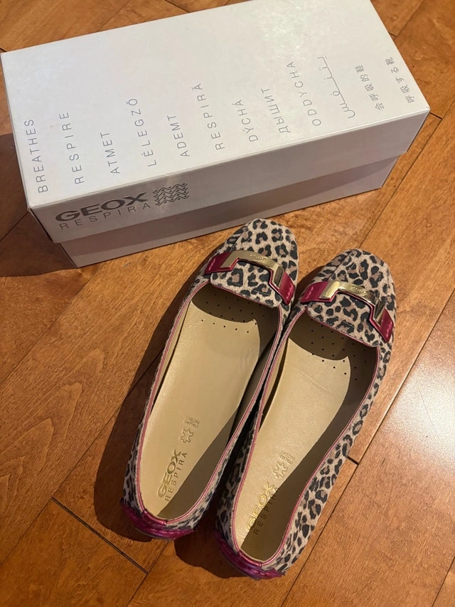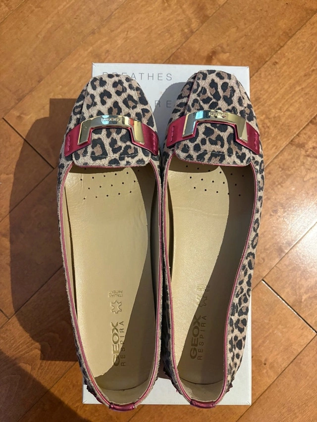 Step out in style with these chic Geox leopard print loafers, size 8! These stylish shoes feature a unique leopard print design with a striking red and gold-tone accent across the front, perfect for adding a touch of wild sophistication to any outfit. These loafers are never used. * Eye-catching leopard print * Stylish red and gold-tone accent * Comfortable slip-on design * Breathable Geox sole Box still available, never worn.