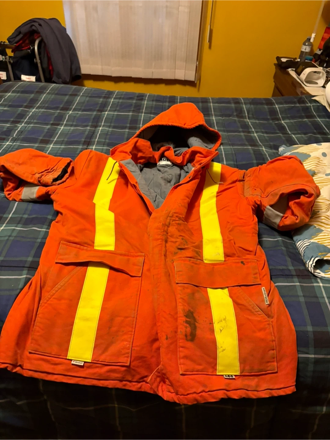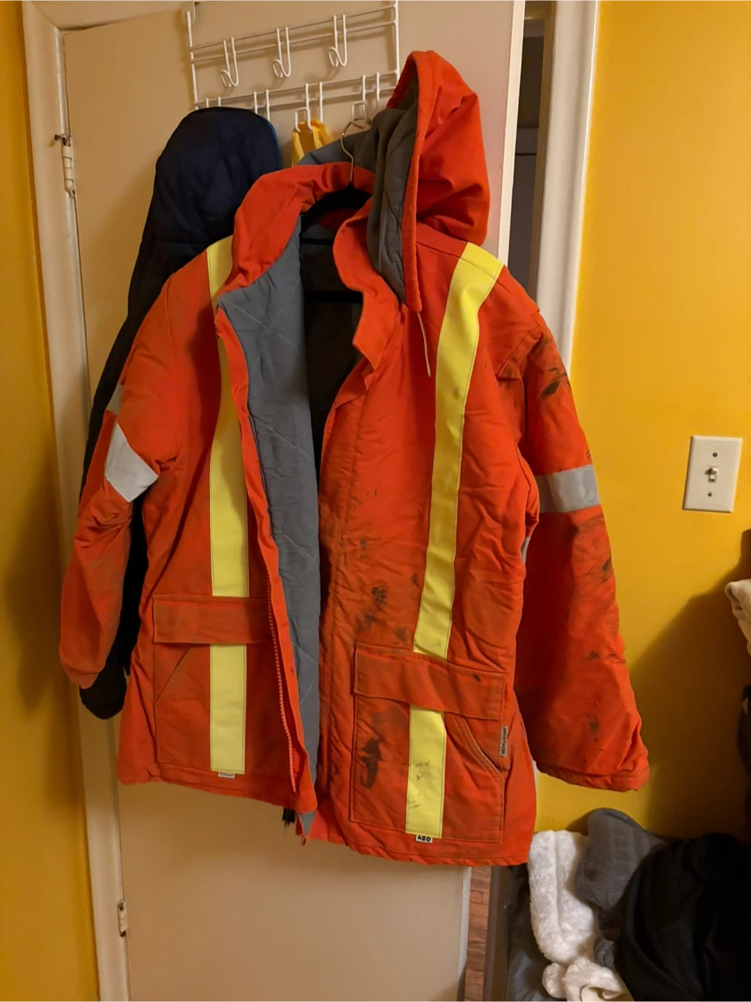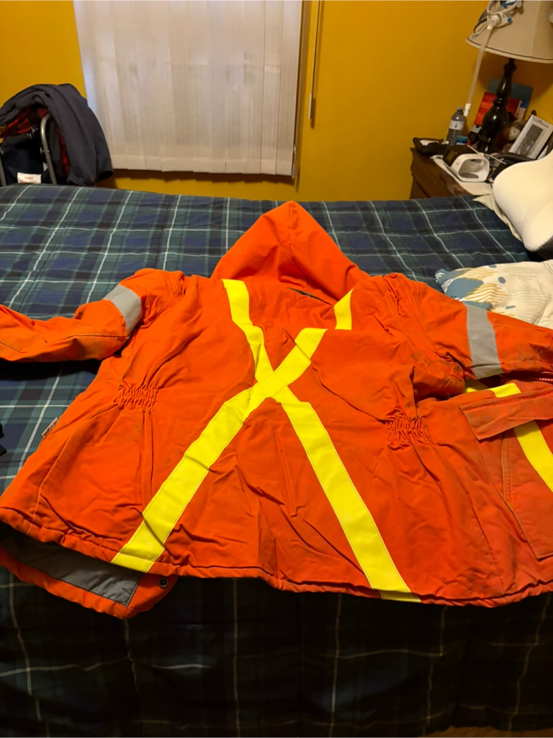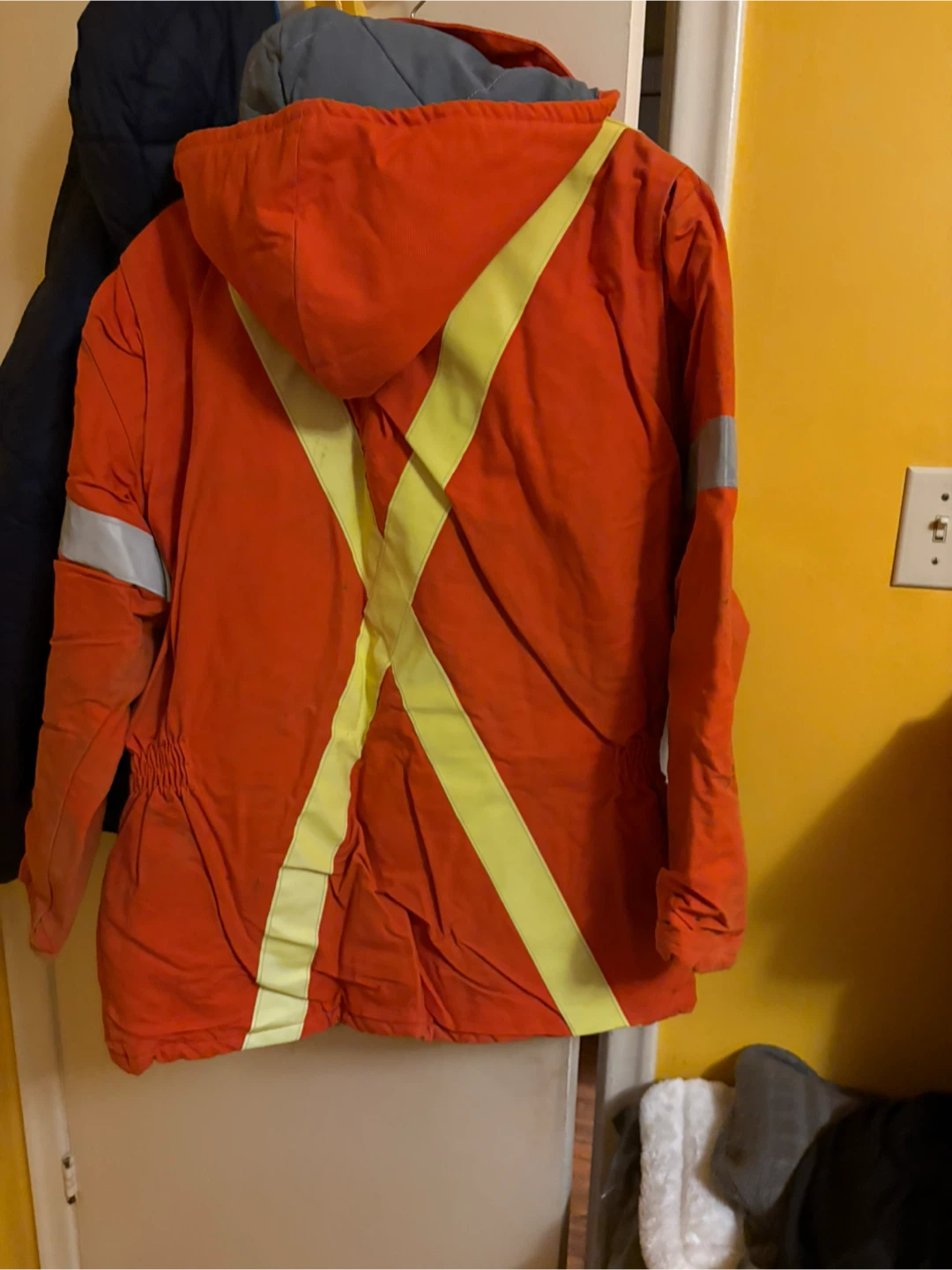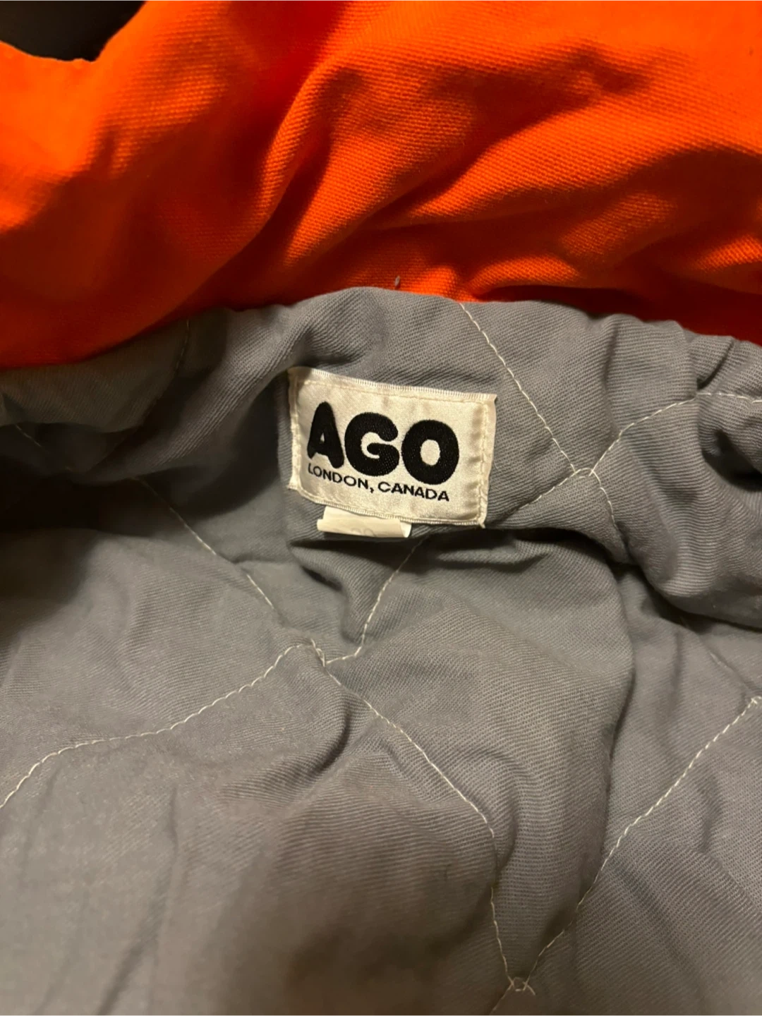 Selling a used AGO safety workwear jacket in orange. It has some wear and tear, as pictured. Perfect for work or outdoor activities where visibility is important!