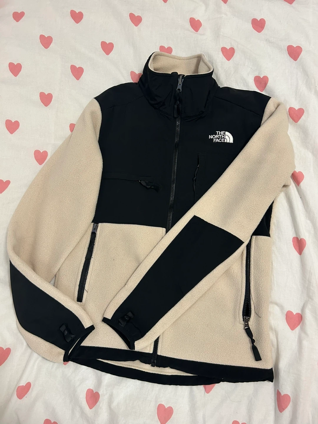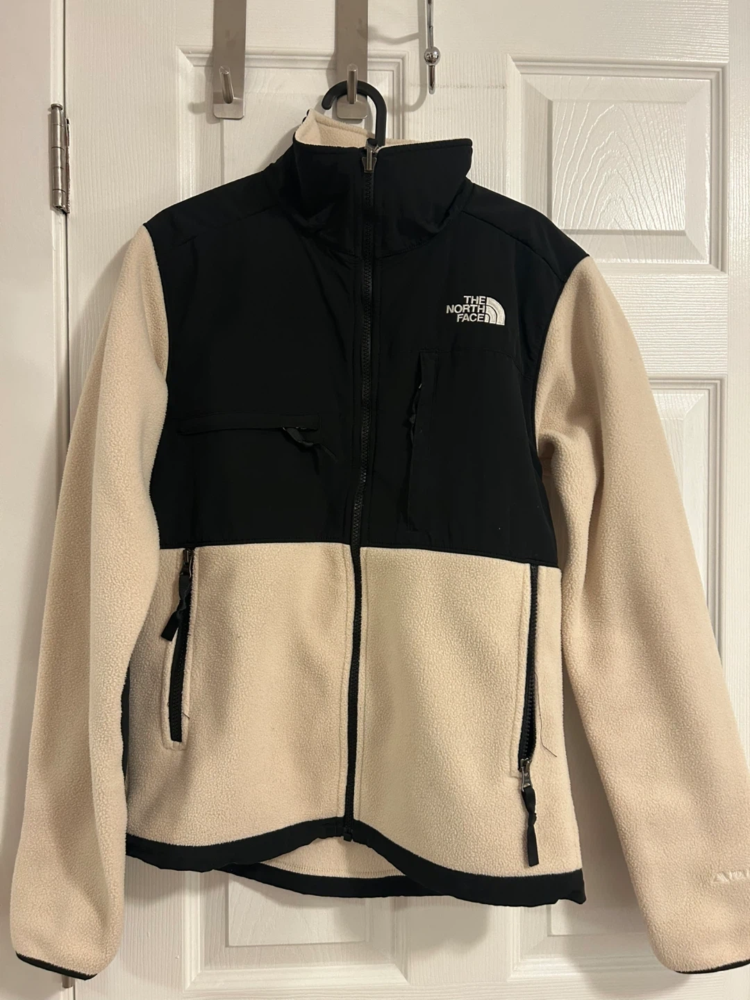 Selling a gently used The North Face Denali fleece jacket. It's a women's size XS and features a cozy fleece material with black and beige colour blocking. Perfect for layering or wearing on its own during cooler weather!