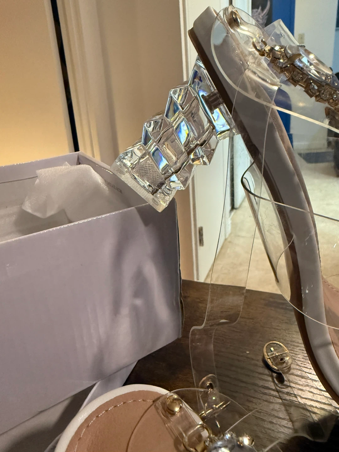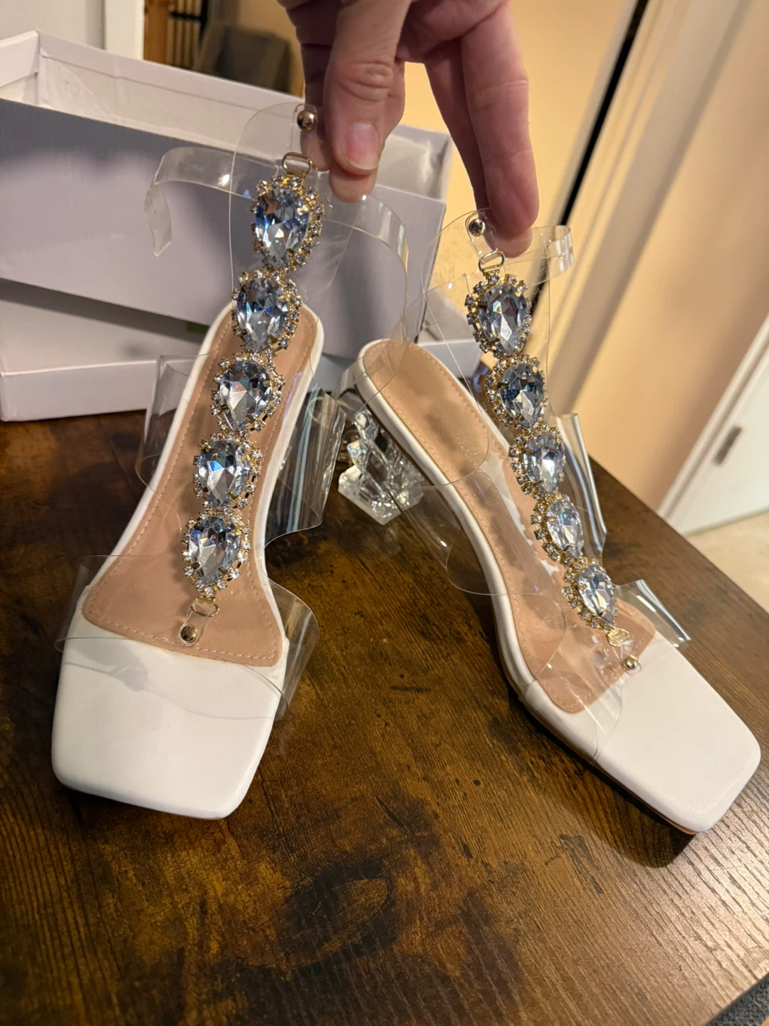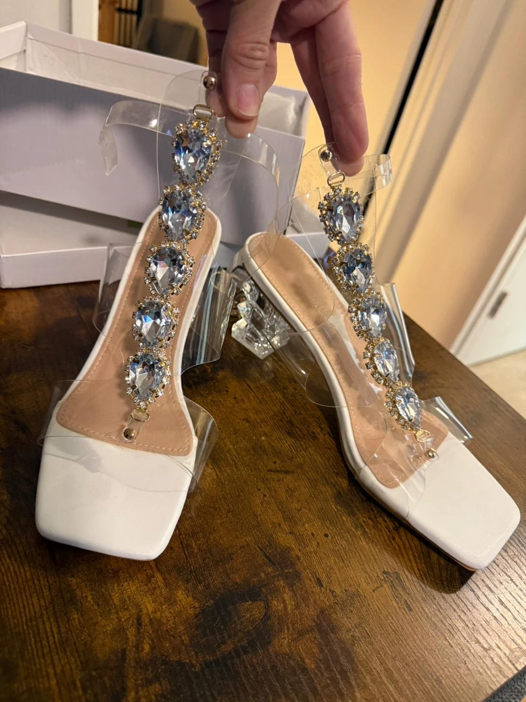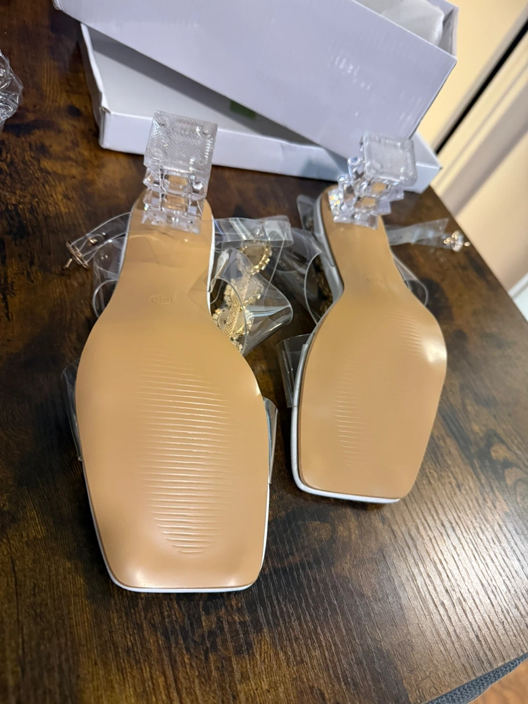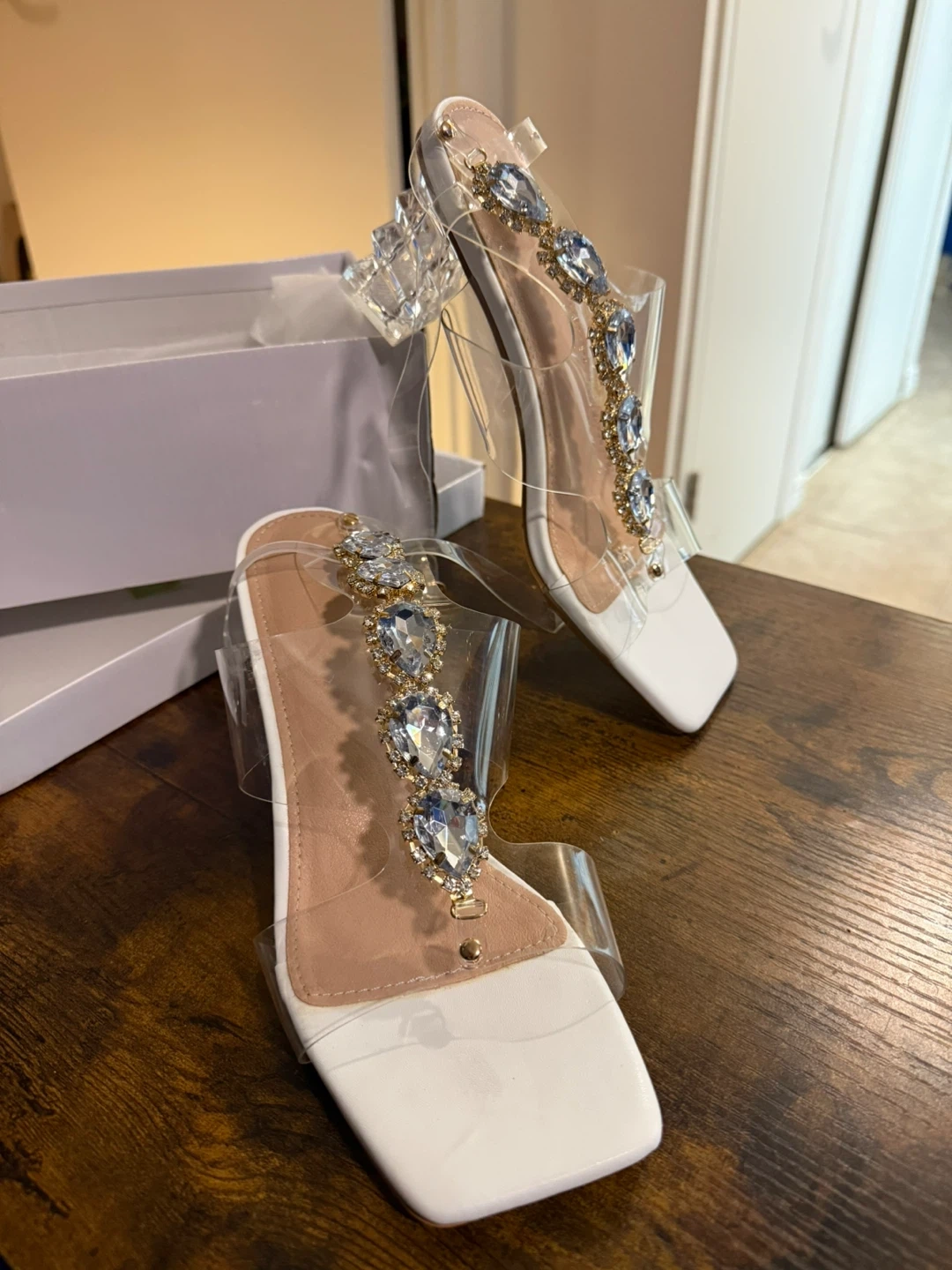 These clear heels are so cute and in great condition! They have a rhinestone design and a unique clear heel. They are a size 8 and come with the box