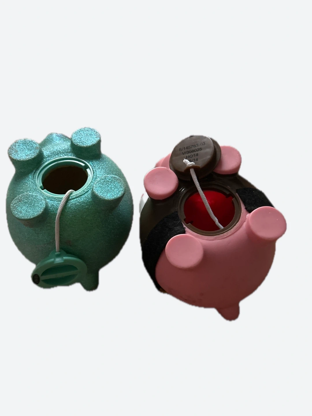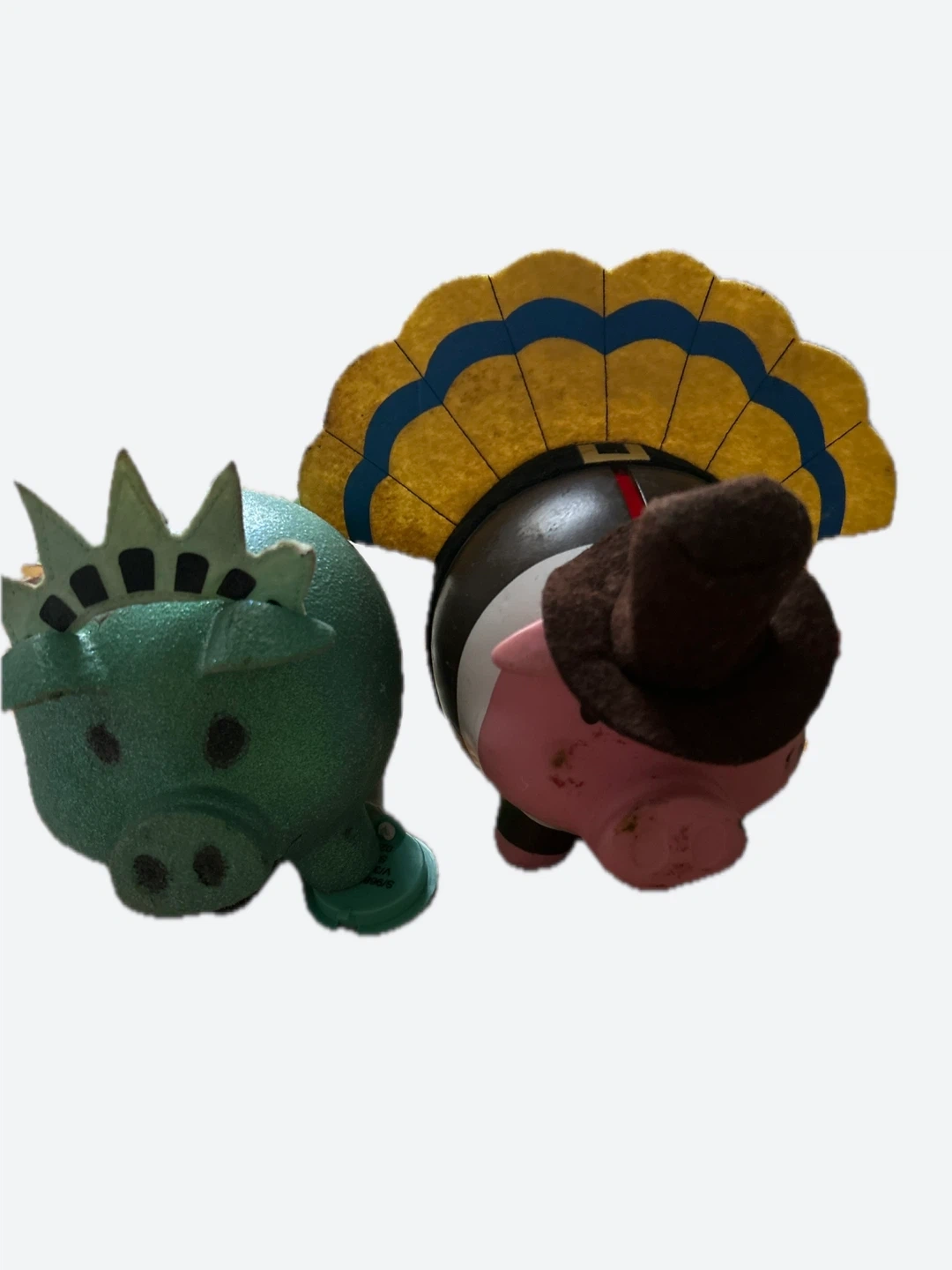 Giving away two piggy banks. One is green and styled like the Statue of Liberty, and the other is pink and styled like a pilgrim