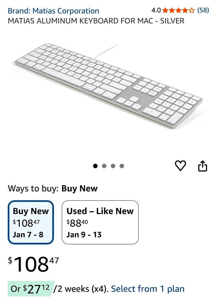1 / 41 / 4Buy & SellMatias Aluminum KeyboardMatias Aluminum Keyboard$26Aluminum Keyboard, works perfectly Retail 108$ on Amazon Selling for $50 Pickup at Bathurst and Harbord Cash or EtransferWHERE TO MEETCheck LocationView MapSELLERverifiedClaireKoreatown1277 reviews0 chats·0 favorites·21 viewsSEND CHAT TO SELLERHi Claire! I’m interested in your listing.Hi Claire! I’m interested in your listing.Get the Karrot app to chatSign In to chat