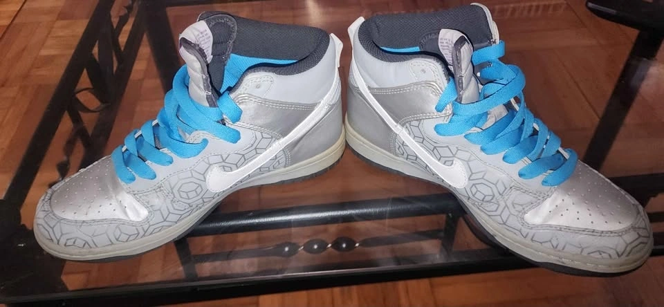 Design: These are a high-top Nike Dunk model that features a distinct pattern or graphic printed on the metallic silver overlay panels of the shoe.