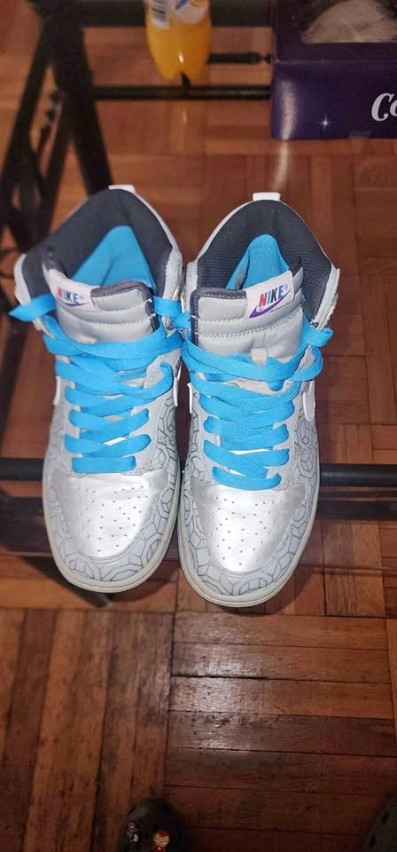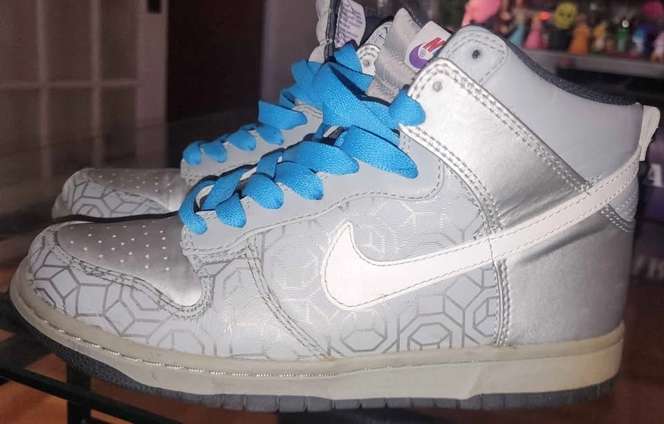 Design: These are a high-top Nike Dunk model that features a distinct pattern or graphic printed on the metallic silver overlay panels of the shoe.
