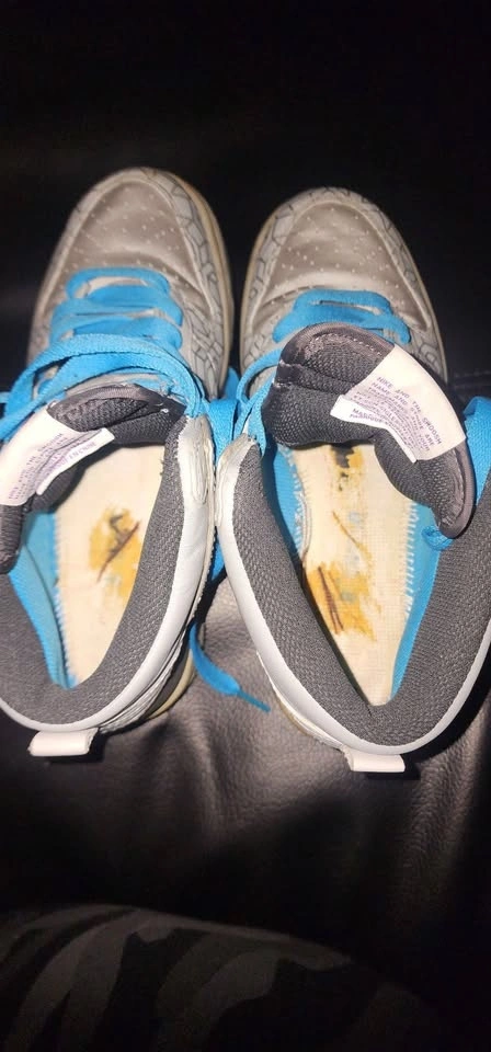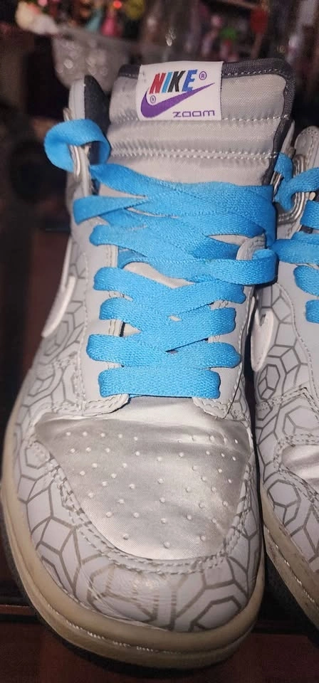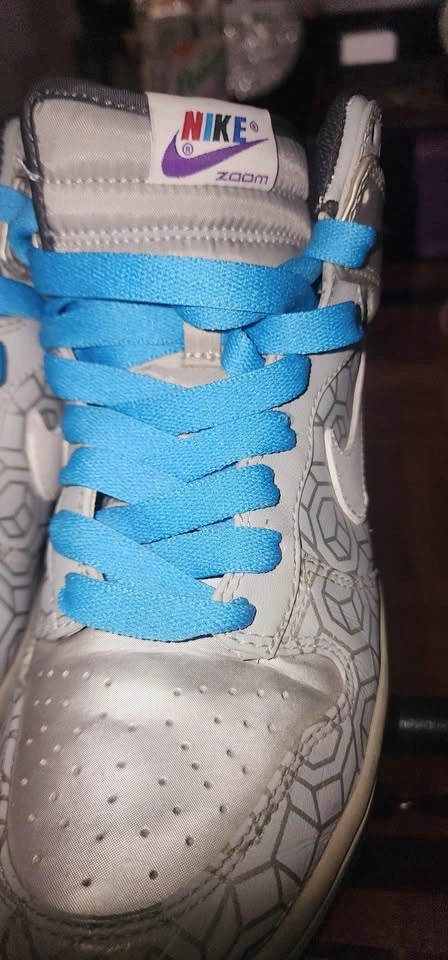They have bright blue laces and inner lining, with the classic Nike swoosh on the side.