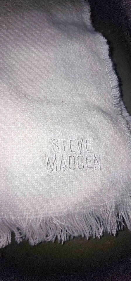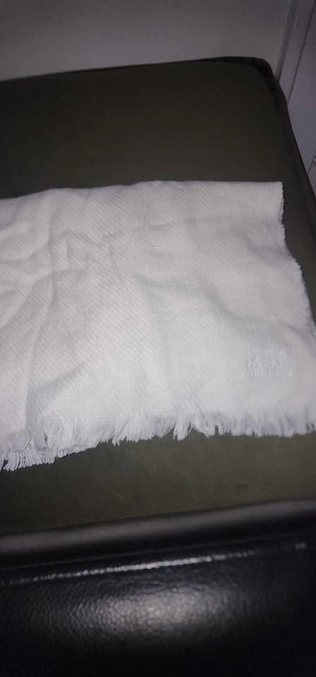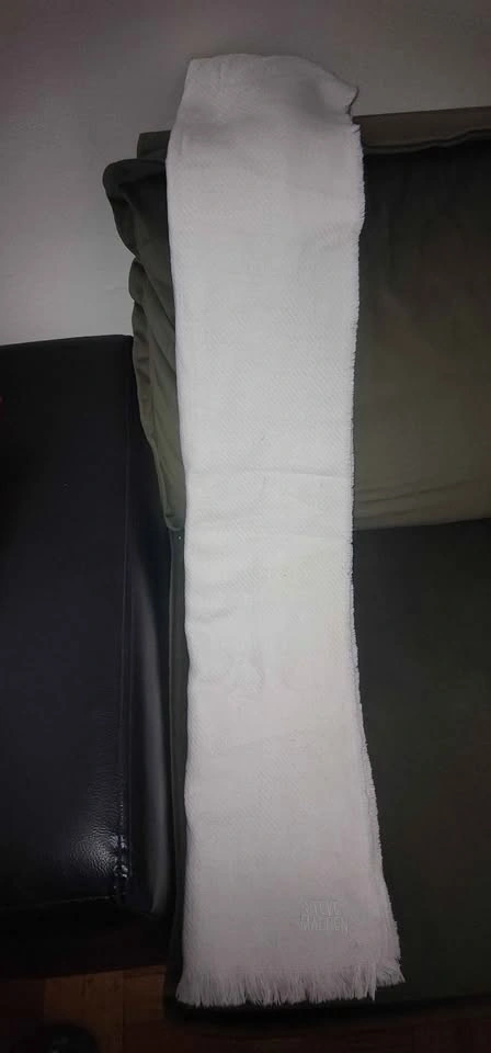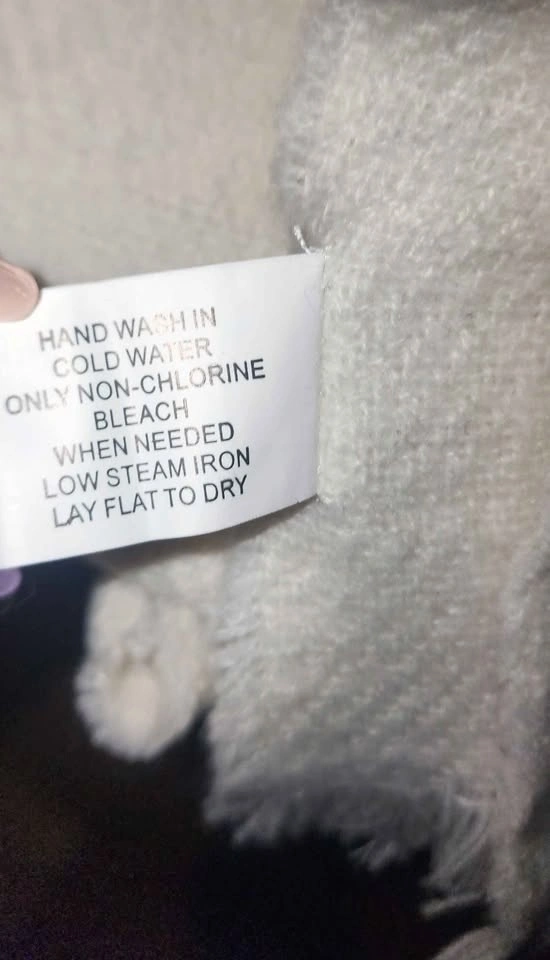 It is a soft, oversized knit accessory with fringe detailing at the ends.