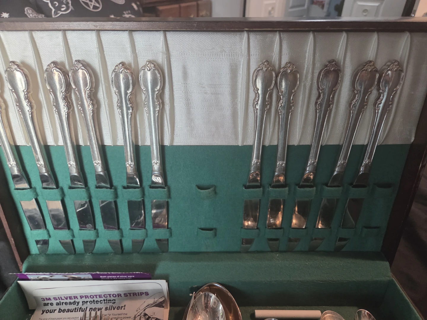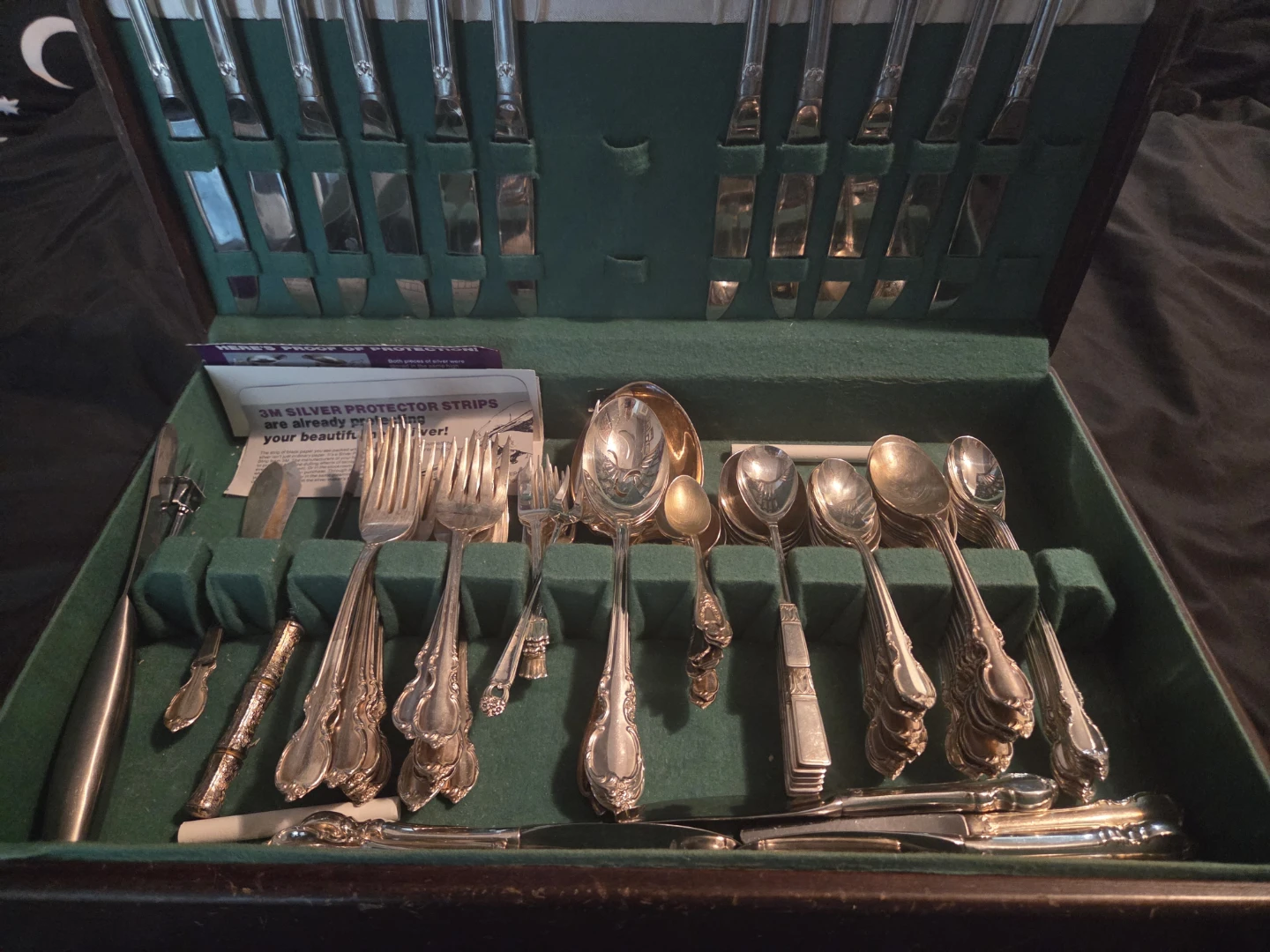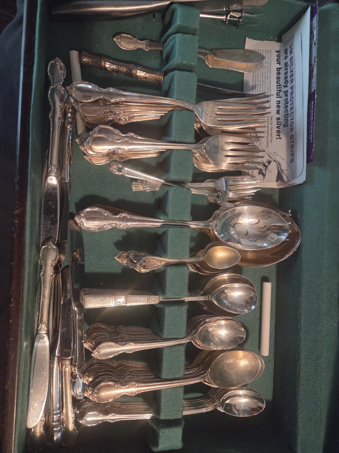 103 pieces ! Selling a almost complete set of 1847 Rogers Bros. IS Reflection silver silverware. It comes with a box and includes 3M silver protector strips to keep the silverware looking beautiful. Some tarnishing on some of the pieces. Not much. Unfortunately the box its scratched but fixable.
