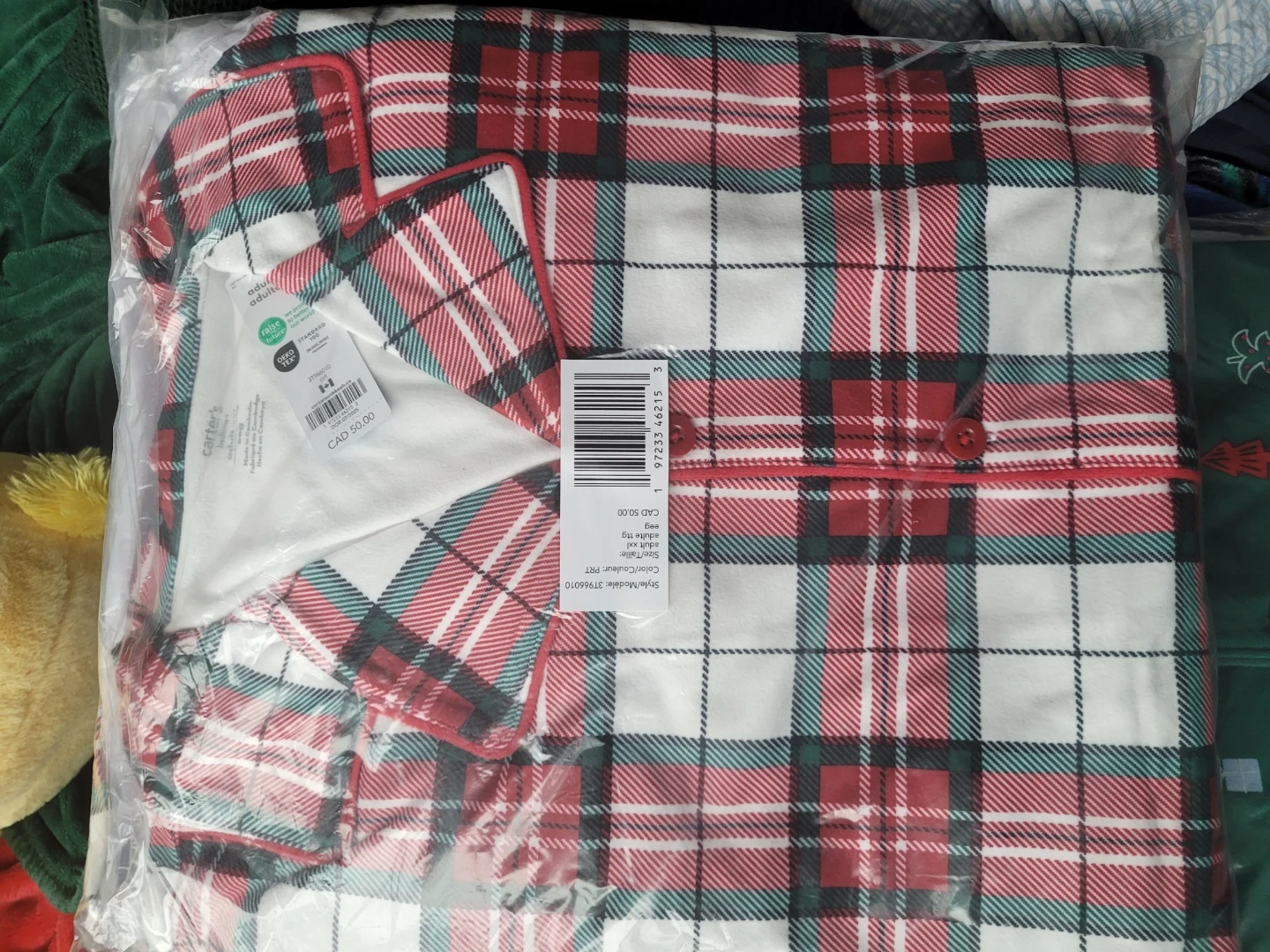 I have a brand new set of plus size carter's adult size XXL pajamas for sale! They're still in the original packaging and have never been opened. The pajamas feature a classic plaid pattern in red, white, and green. Originally $50 CAD.