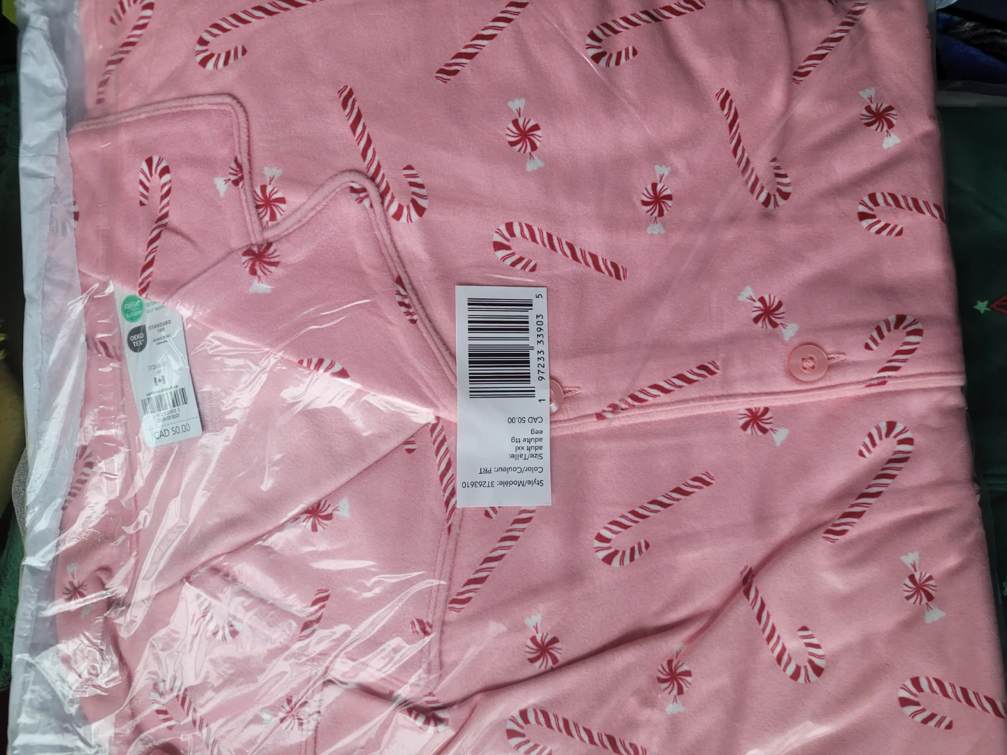 Brand new plus size adult XXL pajamas with a cute candy cane pattern! The original price tag of CAD $50 is still attached, making it a great deal. Perfect for cozy nights!