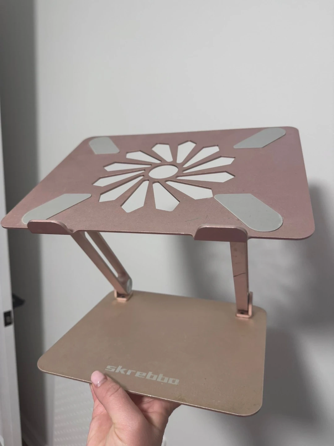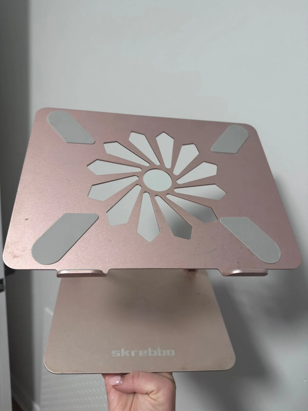 Selling a laptop stand in rose gold! It's in great shape and ready to help elevate your workspace. The stand is lightweight and portable, making it easy to take with you wherever you go