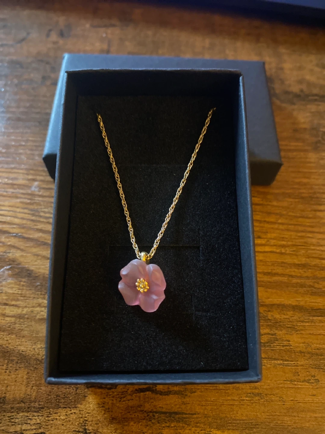 Selling a beautiful flower pendant necklace with a delicate gold chain! It comes in its original box, making it perfect for gifting or keeping it safe. The pendant features a lovely pink flower design. It's in great condition and ready to add a touch of elegance to any outfit