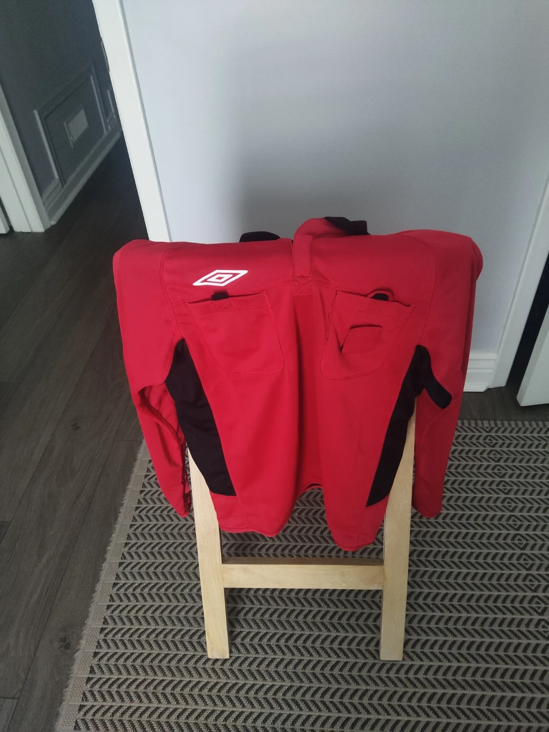 Selling a brand new red Umbro referee jersey in size small. It has the classic Umbro logo and a couple of handy pockets. Perfect for anyone who needs a referee jersey or just likes the sporty look!