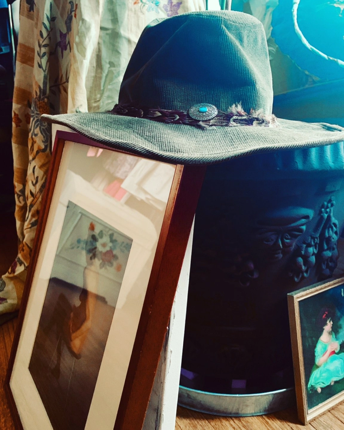 Awesome Vintage Corduroy Hat w/silver, turquoise & feathers