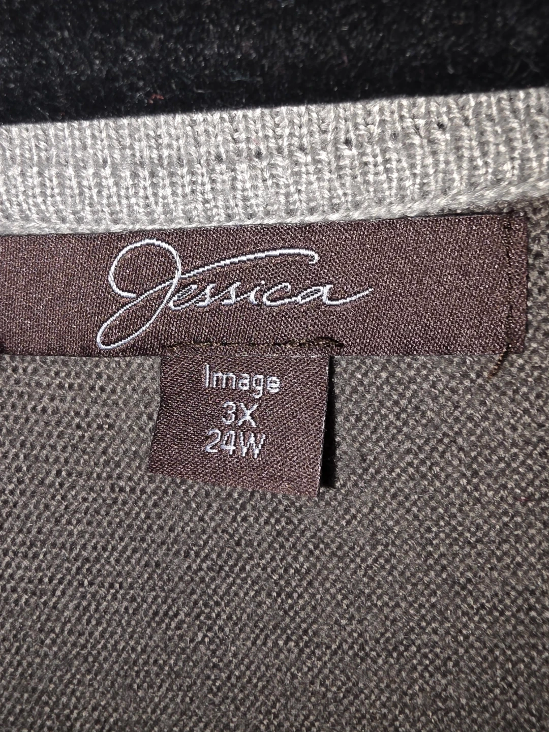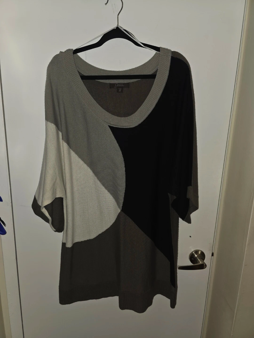 Selling a Jessica colour block sweater in size 3X. It features a unique design with grey, black, and white blocks. Perfect for adding a stylish touch to your wardrobe! Some pilling.