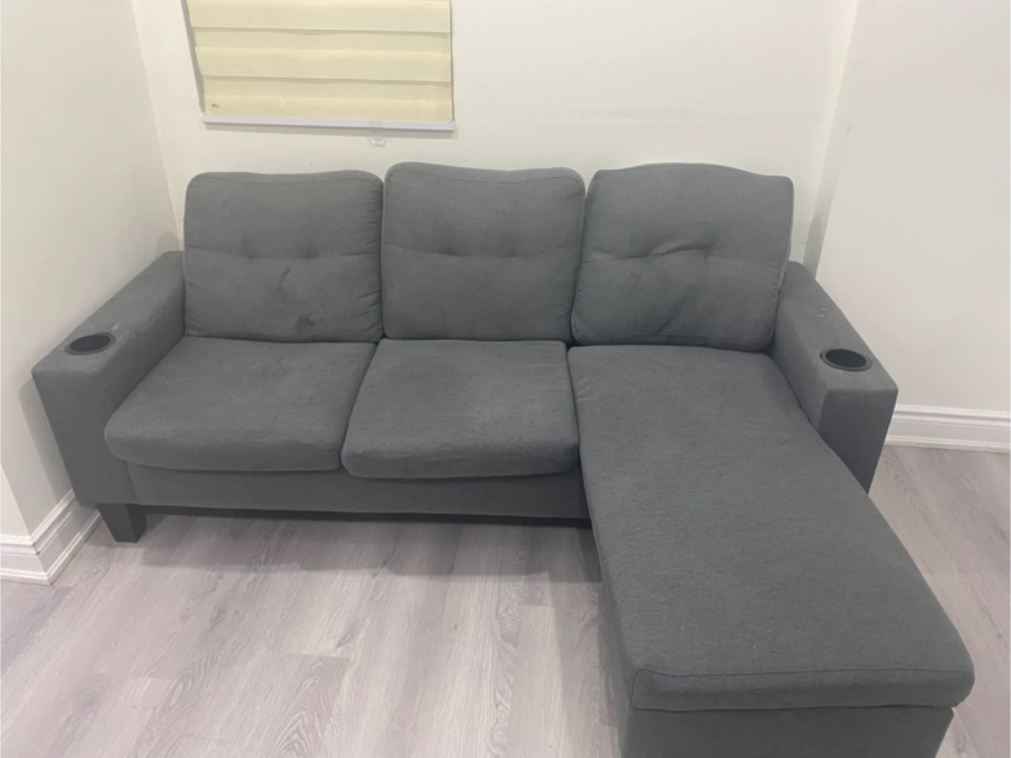 Selling a comfy grey sectional sofa! It features a chaise lounge and convenient cup holders on the armrests. Perfect for relaxing and watching movies!