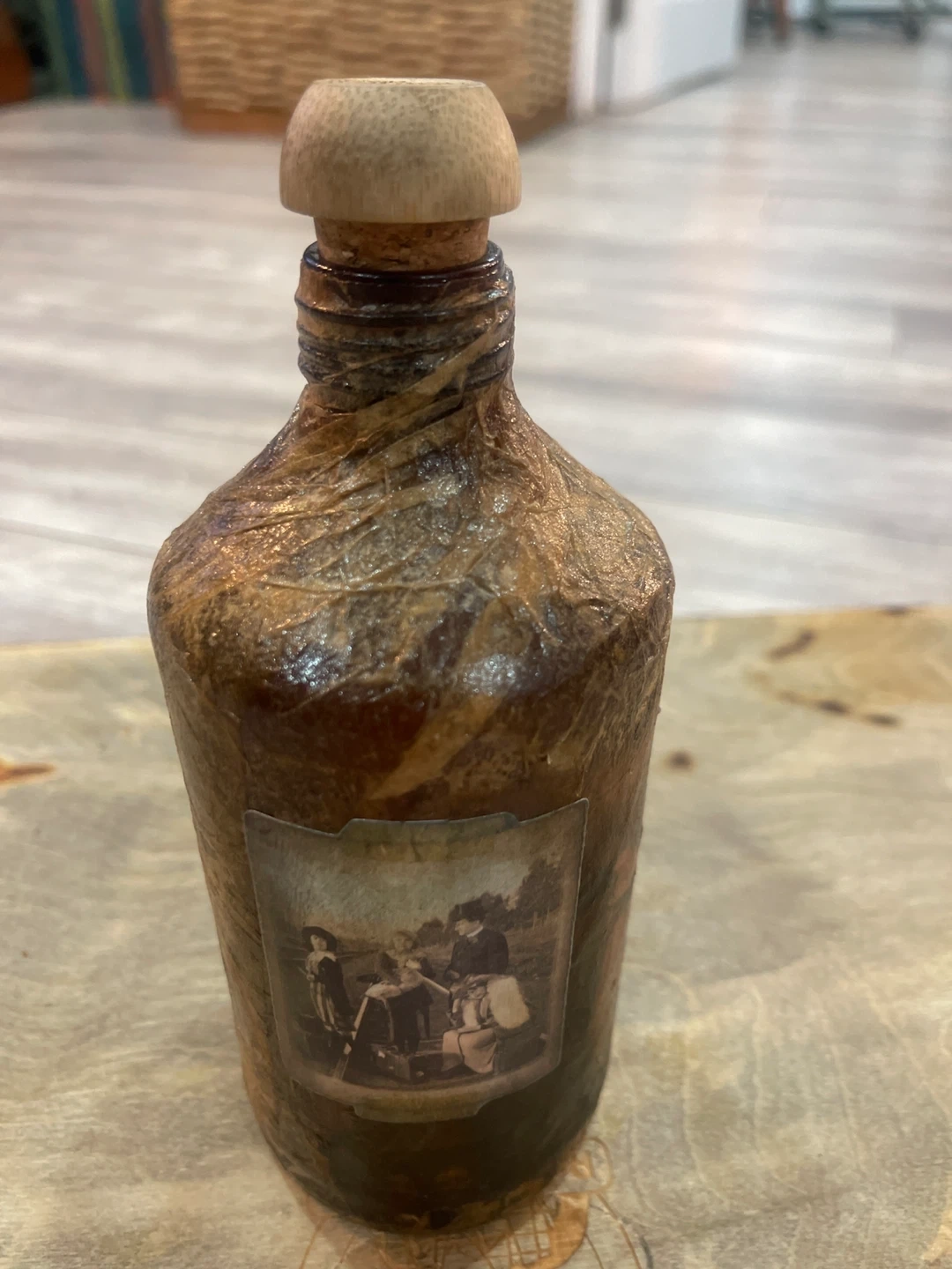 Selling a unique decorative bottle! It has a cork stopper and a vintage-style picture on the front. It would be a great addition to any room.