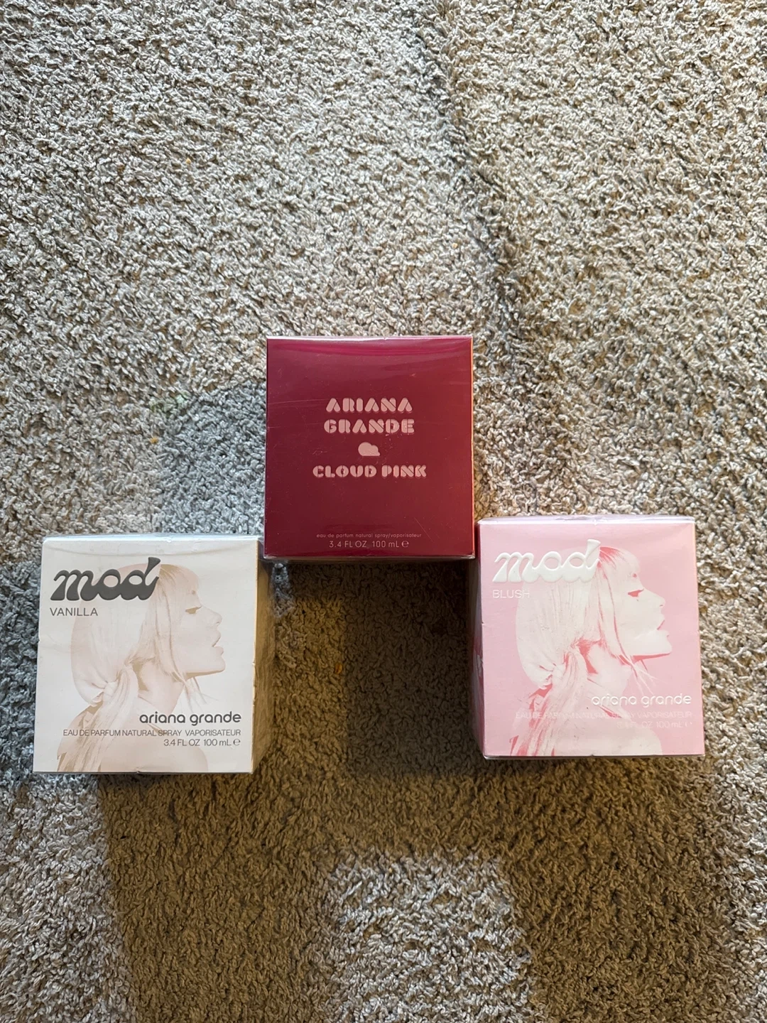 Selling a set of three Ariana Grande perfumes: Cloud Pink, Mod Vanilla, and Mod Blush. Each bottle contains 3.4 fl oz (100 mL). All are in new condition and ready to be enjoyed!