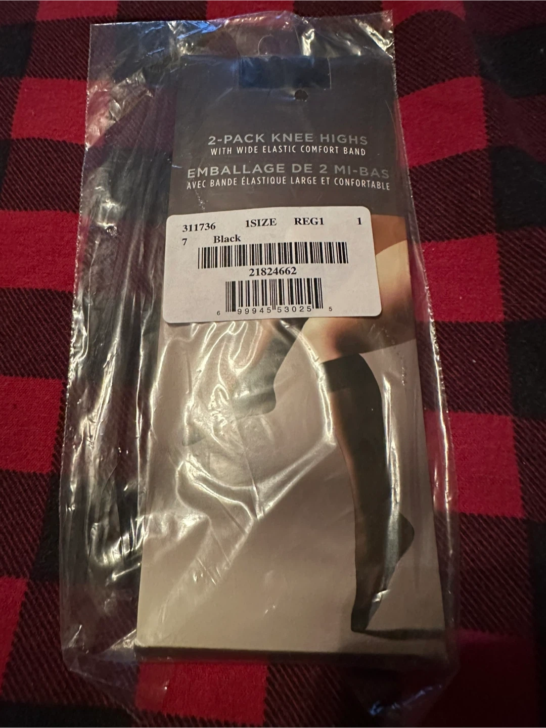 I'm selling a brand new 2-pack of Penningtons knee highs in black! They are one size and made of 100% nylon. These knee highs have a wide elastic comfort band for a great fit. Originally bought for $7. Still in original packaging.