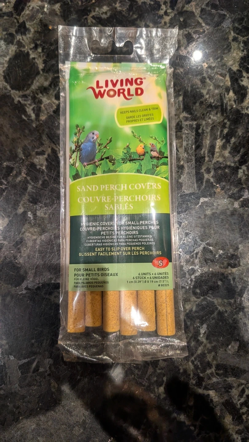 Living World Sand Perch Covers in size small, designed for small birds! These perch covers help keep your bird's nails clean and trimmed, promoting good hygiene. The package includes 6 units. Perfect for maintaining your feathered friend's health and comfort! Opened but couldn't use.