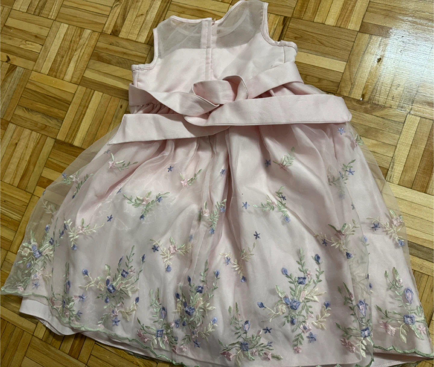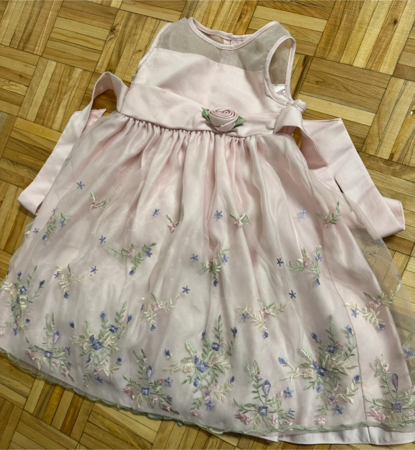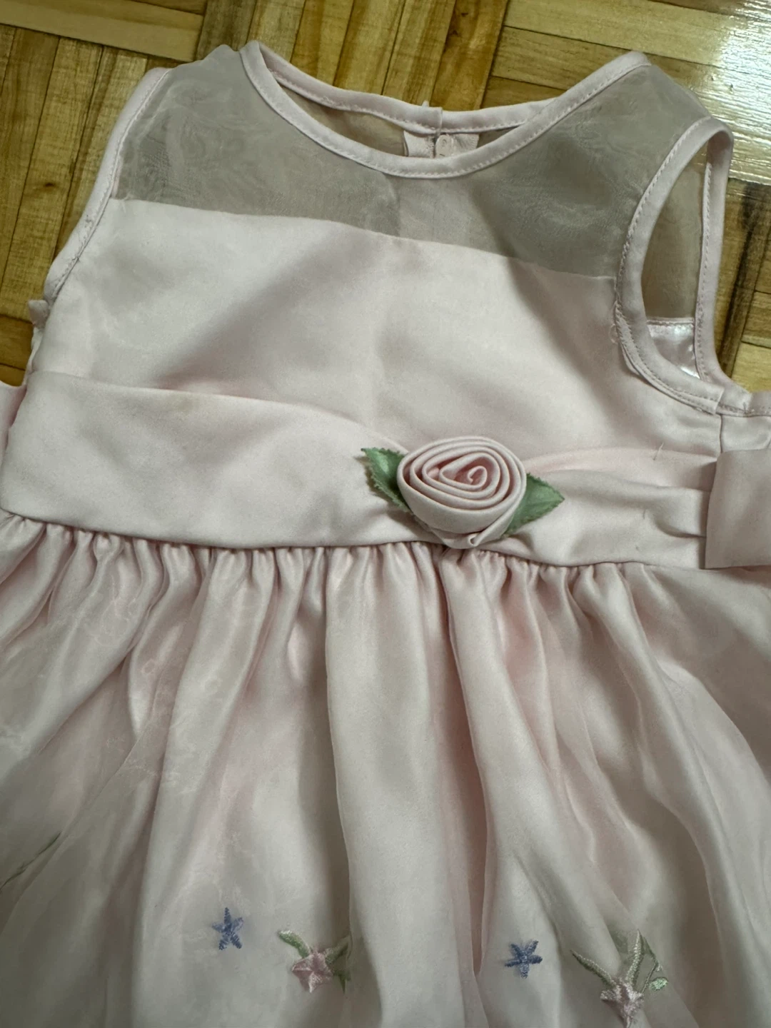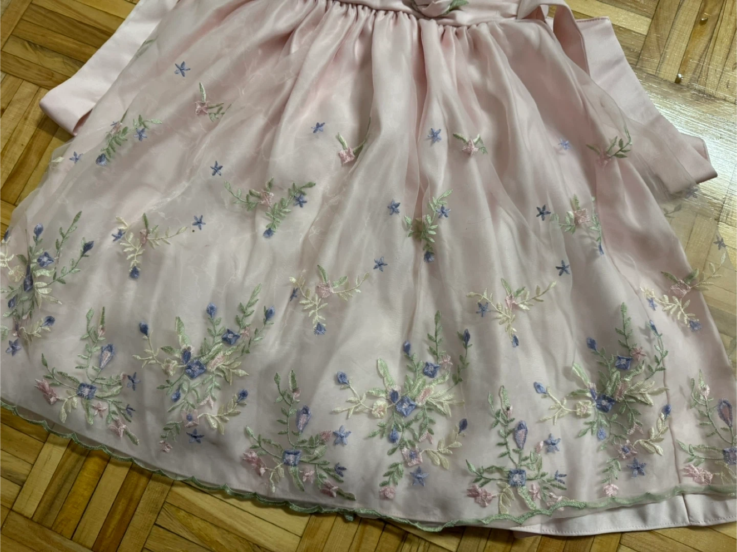 A sweet pink dress with lovely floral embroidery! It features a delicate rose detail at the waist and a bow in the back. Perfect for a special occasion or just feeling fancy!