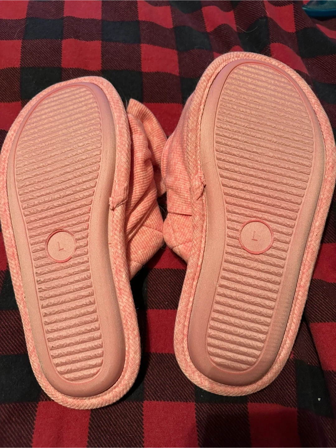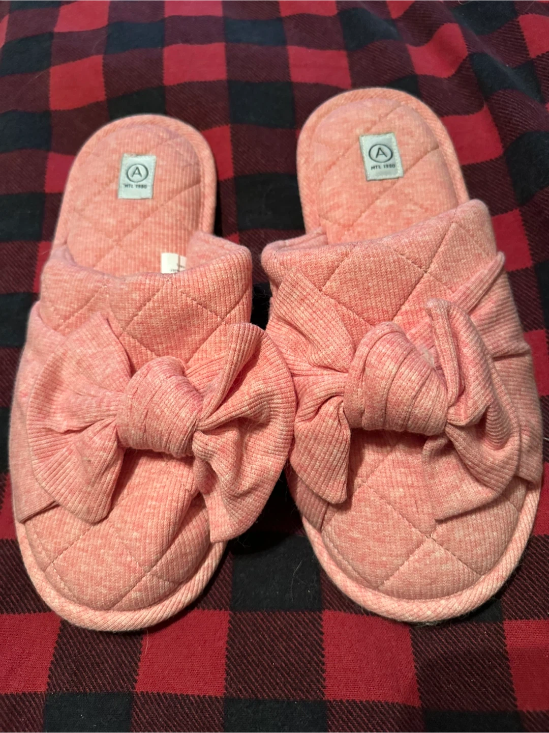 Cute pink slippers with a bow detail! They are a size L and in great condition. Never worn. Mother-in-law passed away and was bedridden shortly after buying so they went unused.