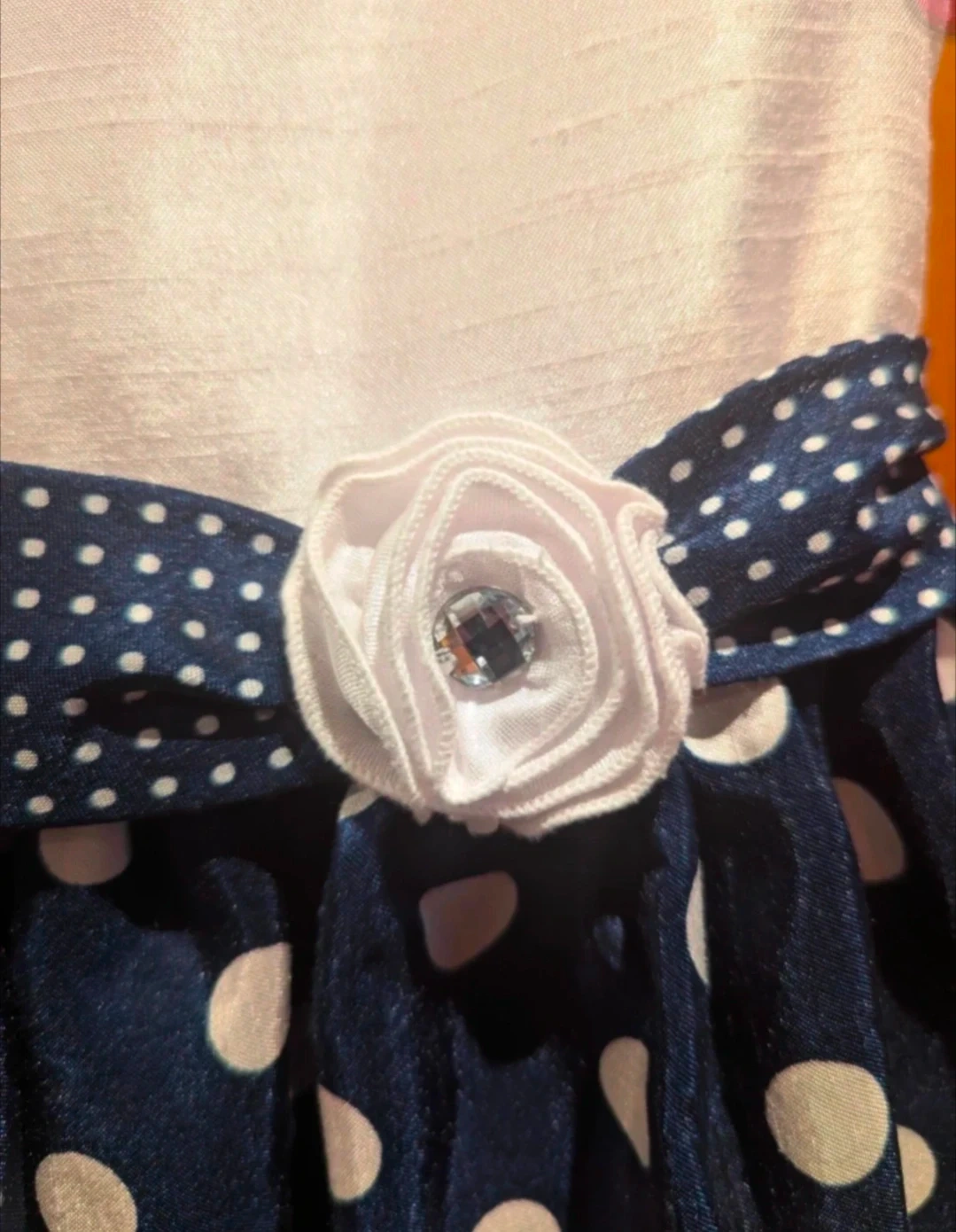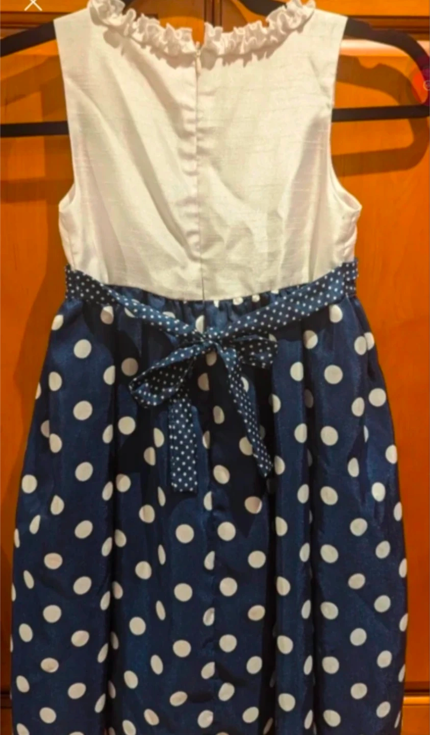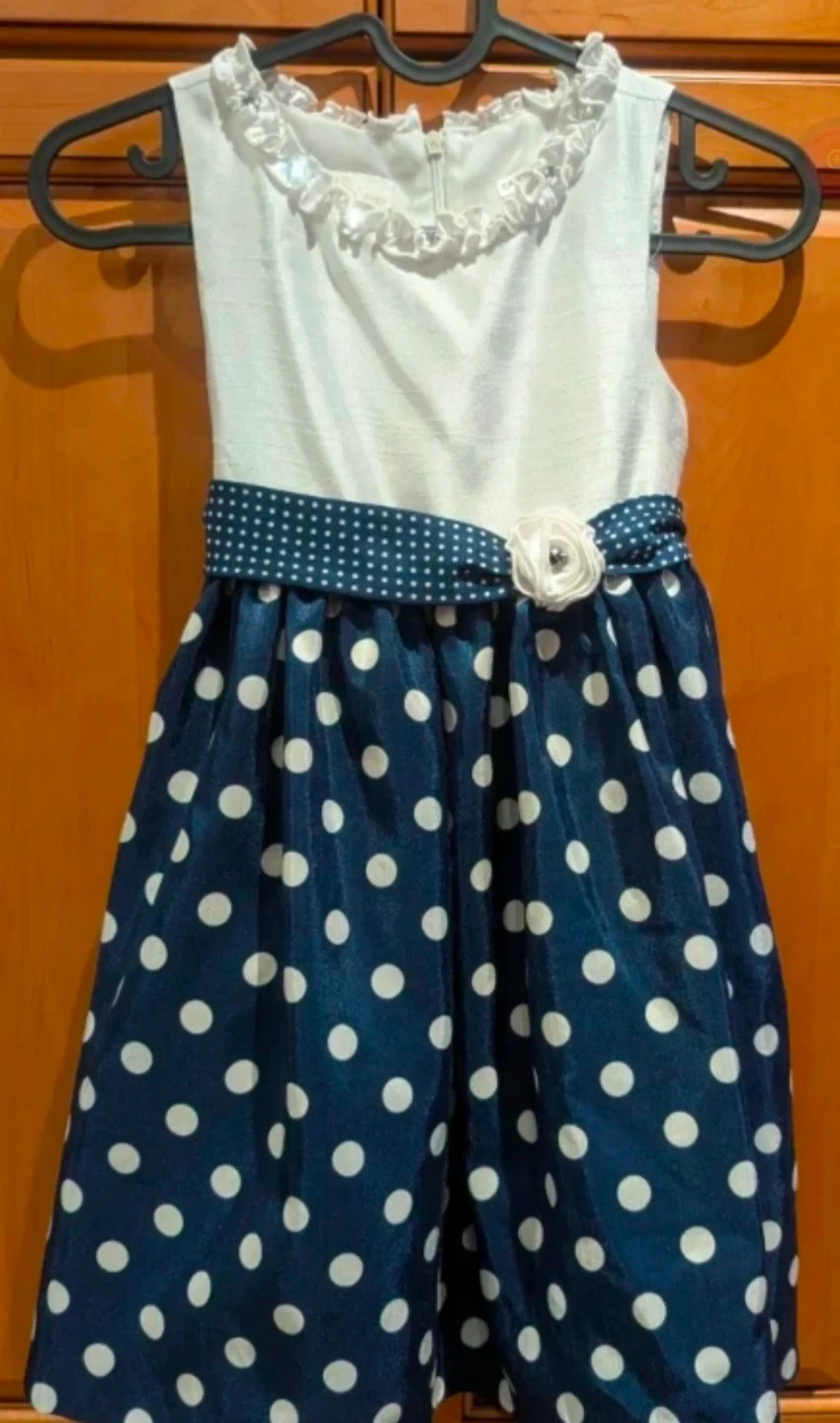 A cute American Princess dress for girls, size 6X! It's in great condition as it has only been worn once and features a white top and a navy blue polka dot skirt with a cute bow. Perfect for parties or special occasions.