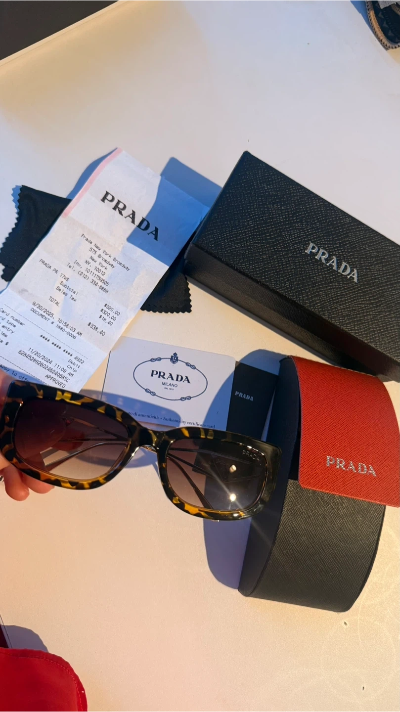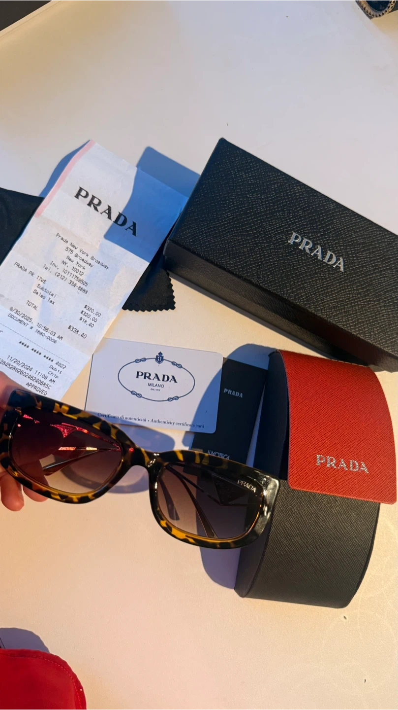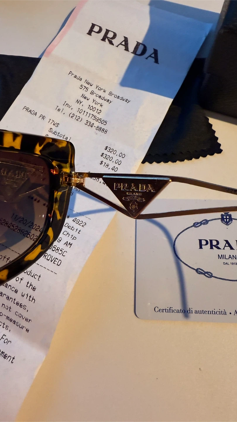 Selling a pair of Prada PR 17WS sunglasses in a stylish tortoise pattern! They are in excellent condition and come with the original box, case, and authenticity certificate. The receipt shows they were originally bought for $320 plus tax. A great accessory to complete any outfit!