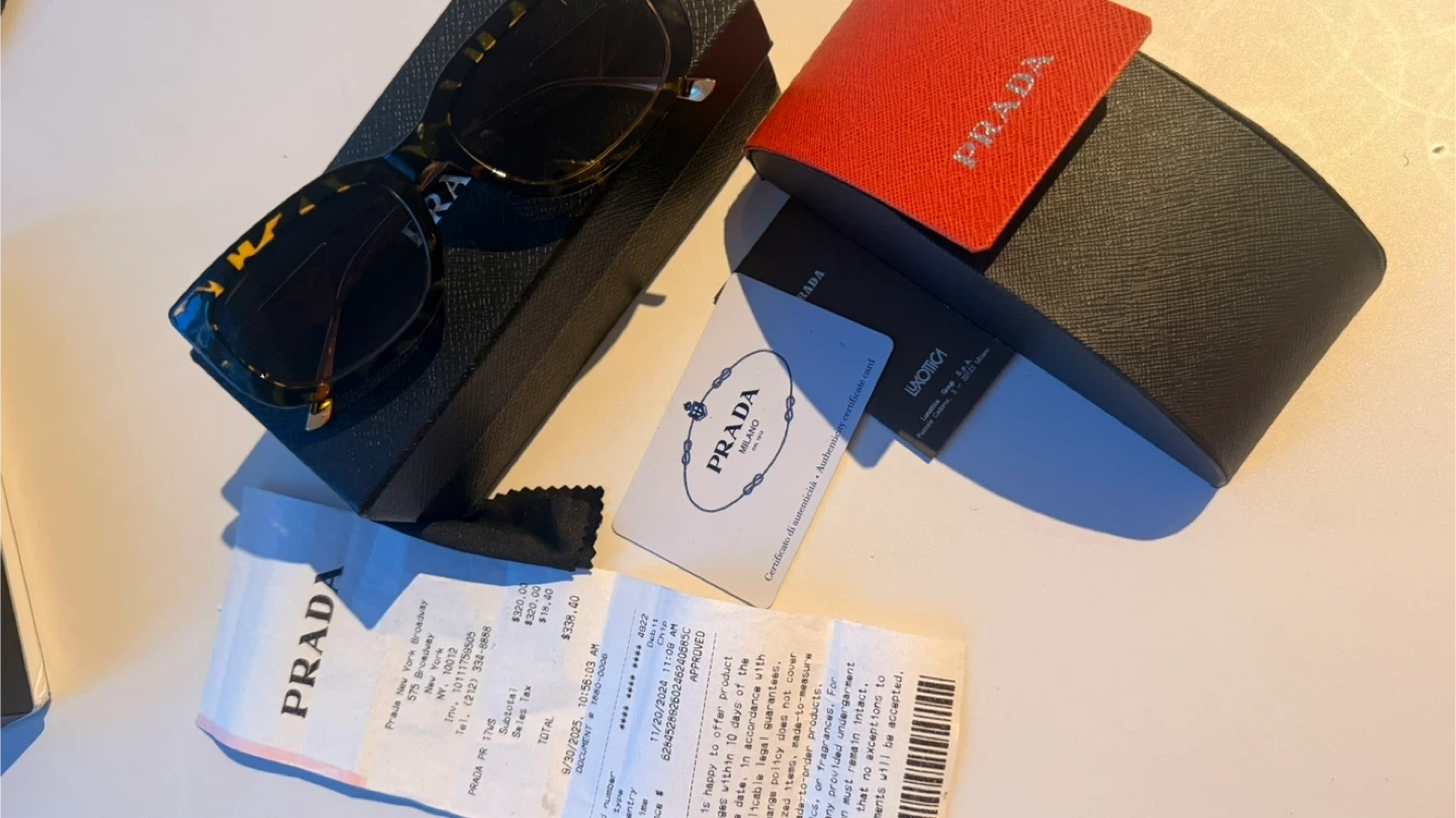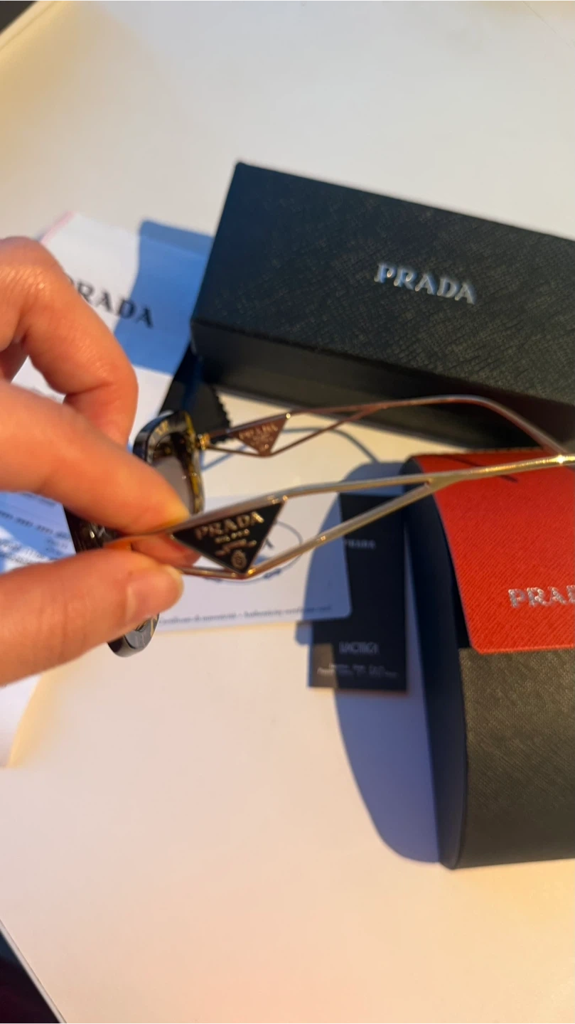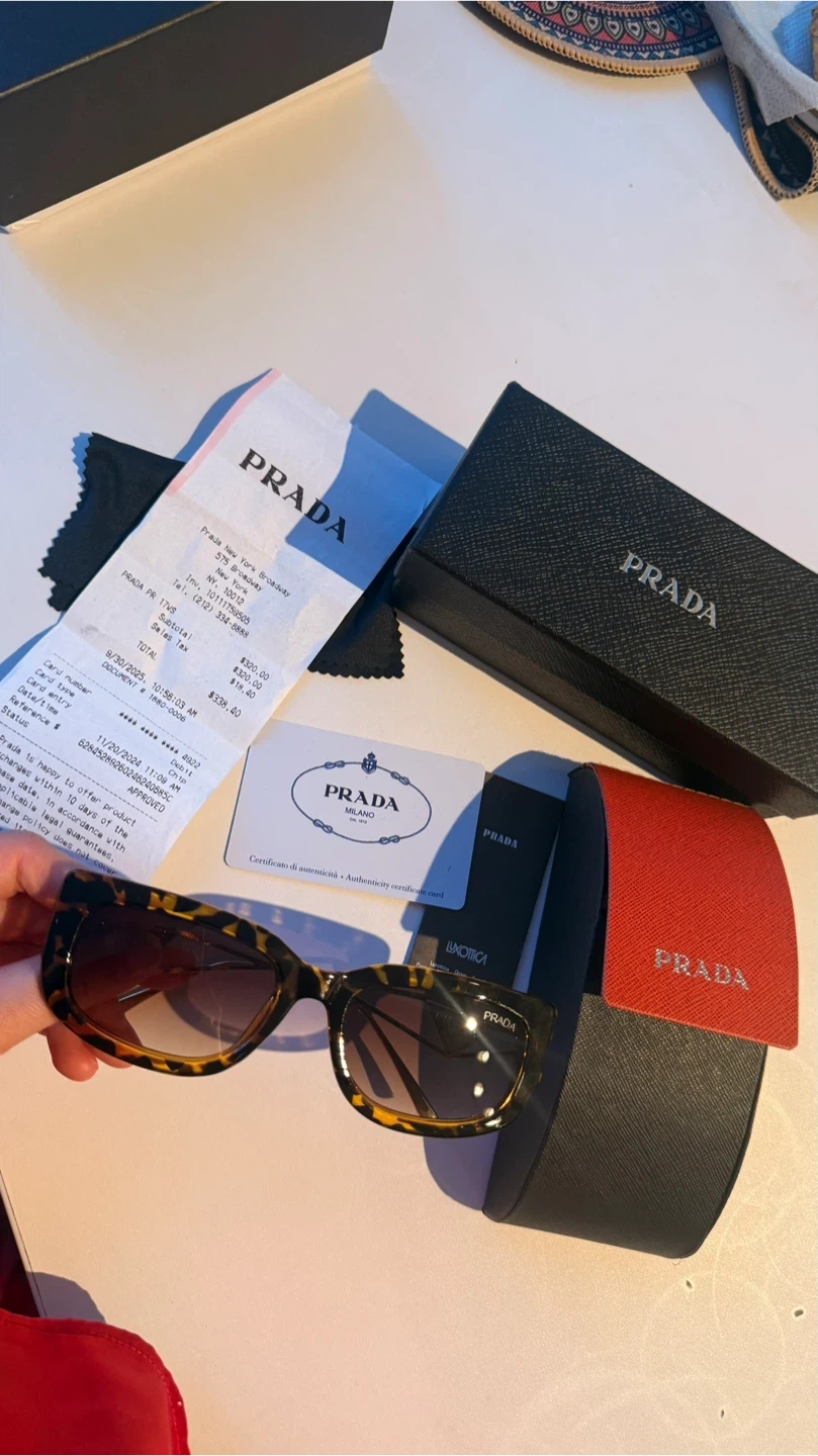 Selling a pair of Prada PR 17WS sunglasses in a stylish tortoise pattern! They are in excellent condition and come with the original box, case, and authenticity certificate. The receipt shows they were originally bought for $320 plus tax. A great accessory to complete any outfit!