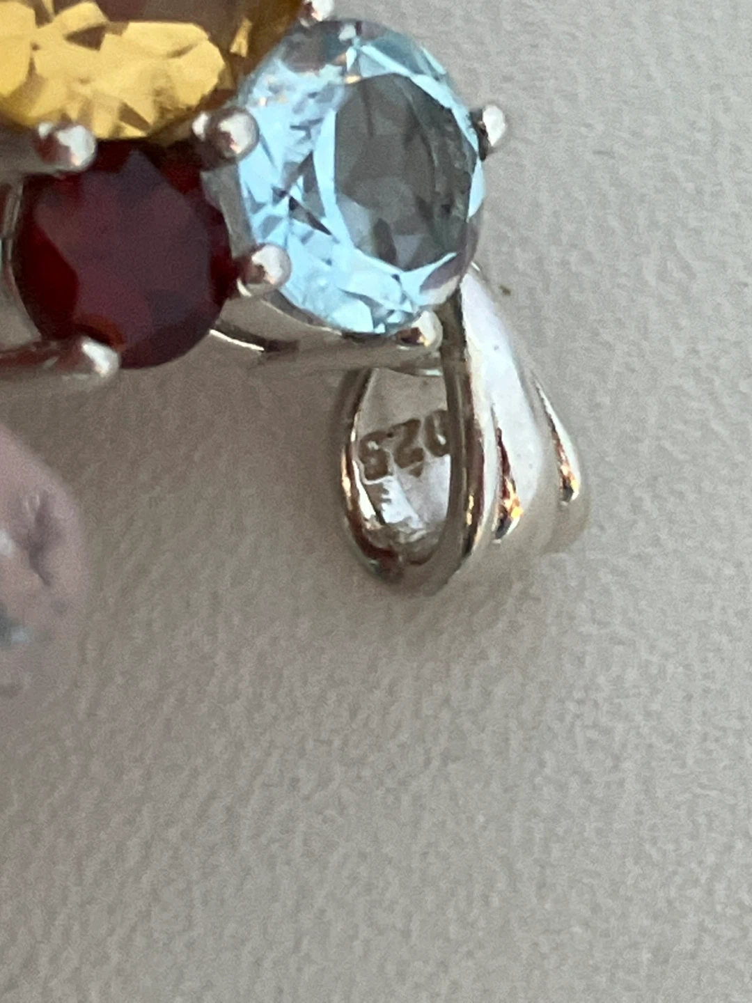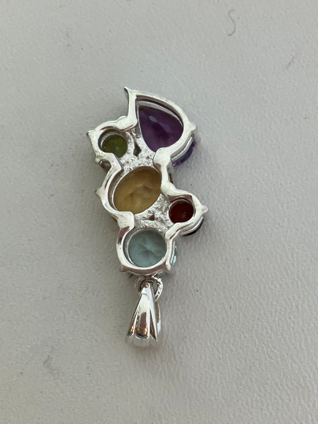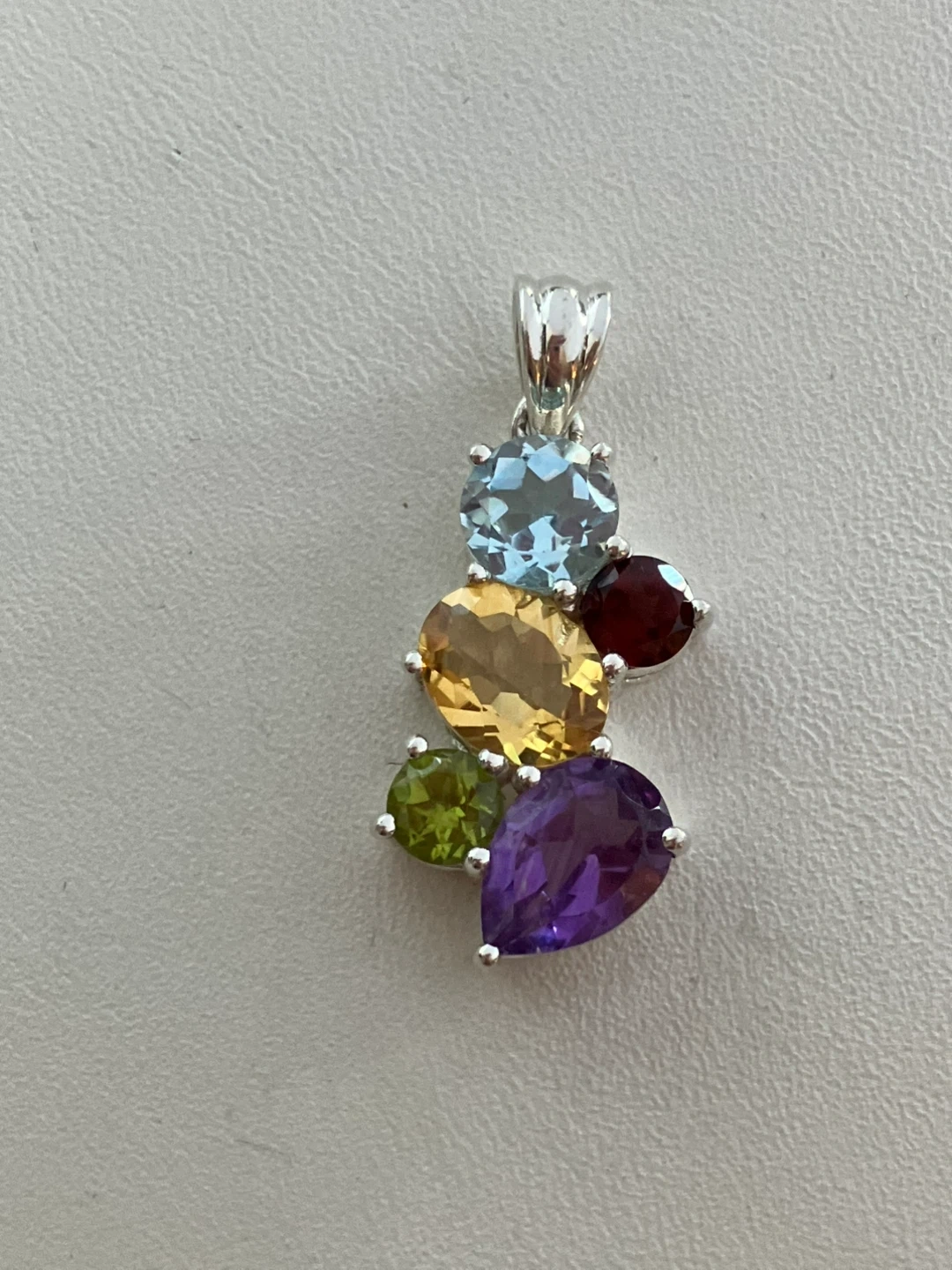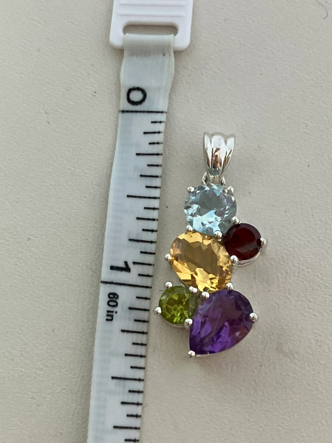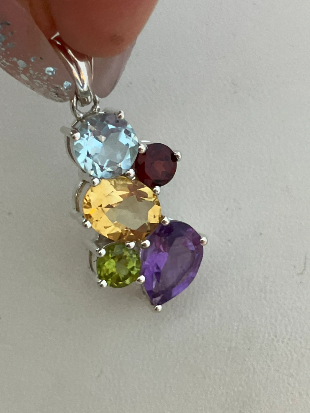 Selling a beautiful Blue topaz, Amethyst, Garnet, Citrine, Peridot pendant. It's crafted with 925 silver and features a variety of colourful gemstones. The pendant measures approximately 1.5 inches in length. It would make a lovely addition to any jewellery collection!