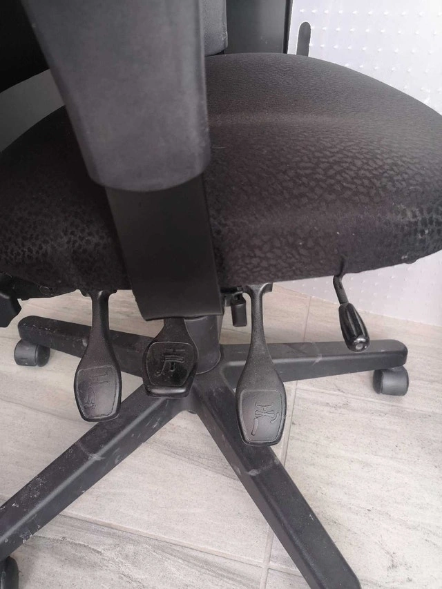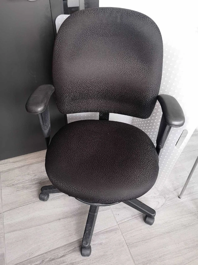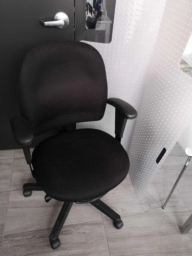 This is a used office chair, perfect for your home office or study space. It features adjustable height and swivel function for maximum comfort and flexibility while you work. The chair is in good condition and ready to provide support for hours of productivity. Here are some details: * Adjustable Height and other 4 positions * Swivel Base * Comfortable Padding excellent condition, without floor mat $45, with floor mat $60 great products, no damage