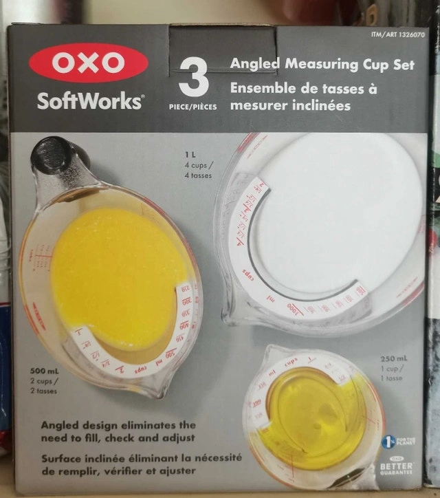 Here's a brand new OXO Softworks 3-piece Angled Measuring Cup Set, including 250ml, 500ml, and 1L sizes, perfect for accurately measuring ingredients with ease in your kitchen.