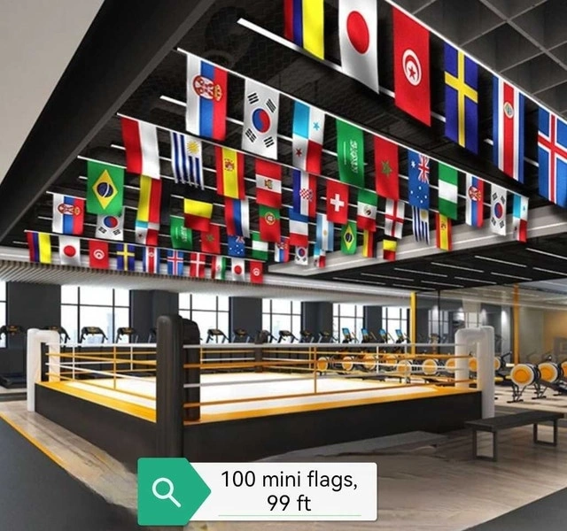 Elevate your space with this vibrant set of 100 mini international flags, stretching a generous 99 feet, perfect for adding a global touch to any room or event. These flags are brand new and ready to be displayed, showcasing a colourful array of nations.