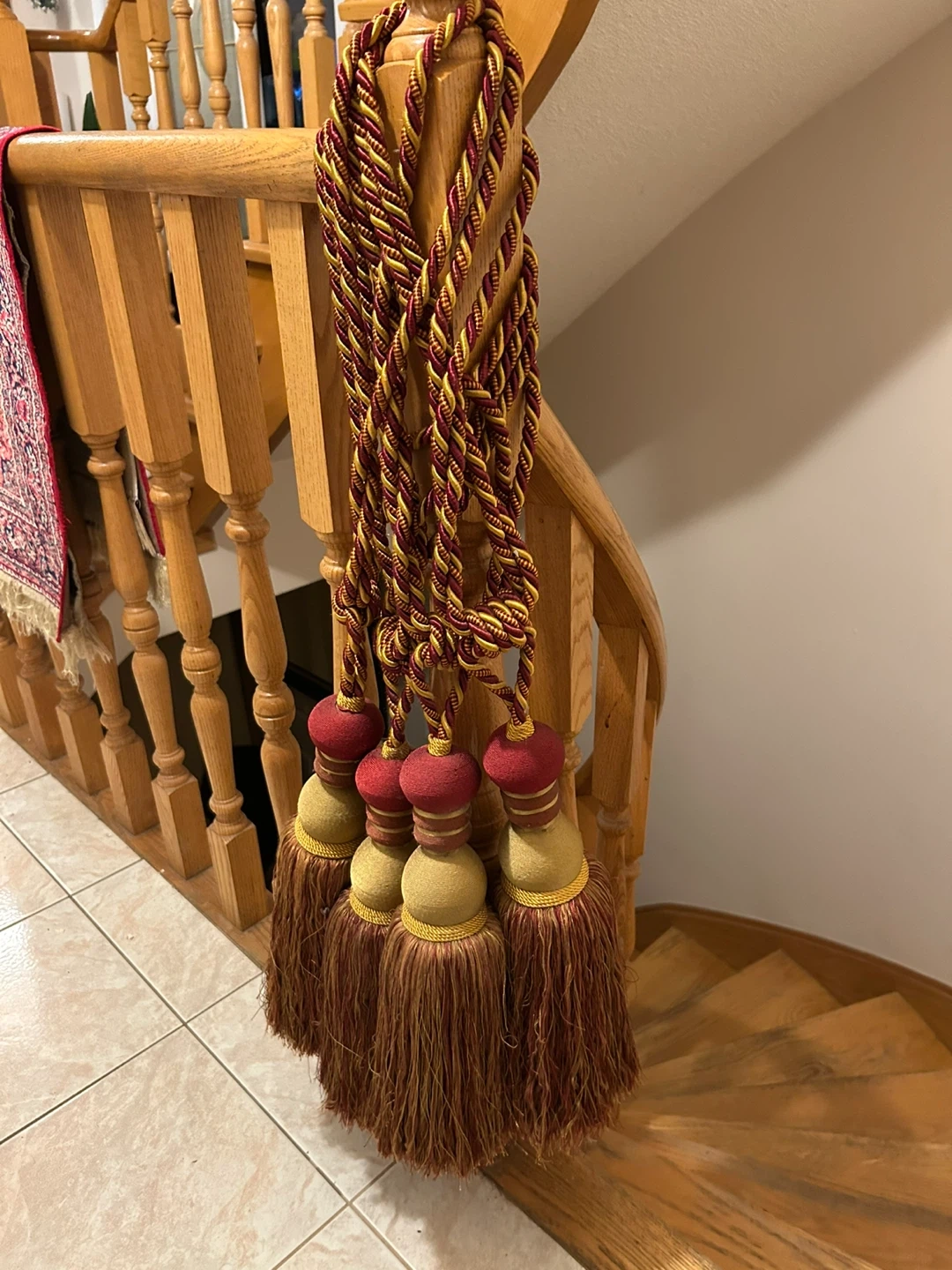 Selling a set of decorative tassels in burgundy, gold, and brown. They would make a great addition to curtains, furniture, or as decorative accents in your home. They have a lovely, rich colour and texture!