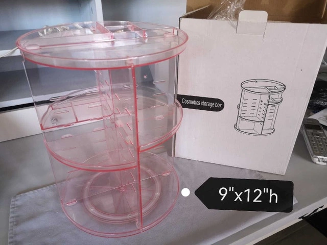 Keep your makeup and skincare products neatly organized with this 360-degree rotating adjustable cosmetic storage box, with dimensions of 9"x12"h! This handy organizer is used but in good condition, ready to bring order to your vanity or bathroom counter. Features: * 360-degree rotation for easy access * Adjustable shelves to accommodate various product sizes * Durable and easy-to-clean material Looking to declutter your space? This cosmetic storage box is the perfect solution! If the ad is up, it's available! priced this one competitively.