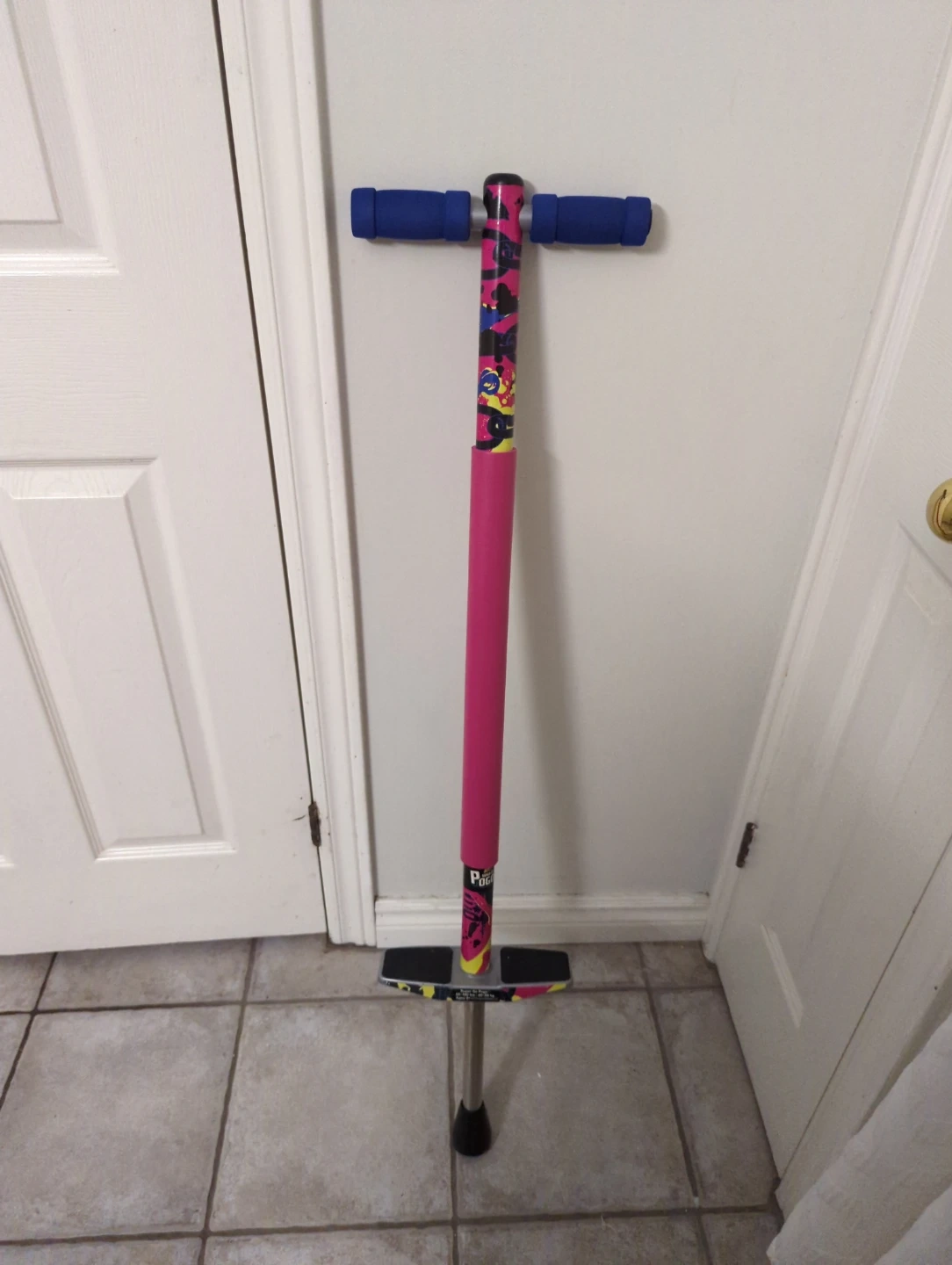 Selling a pogo stick! It's mostly pink with blue handles and a black and yellow design on the base and top. Great for some outdoor fun! Used a couple of times indoor only.