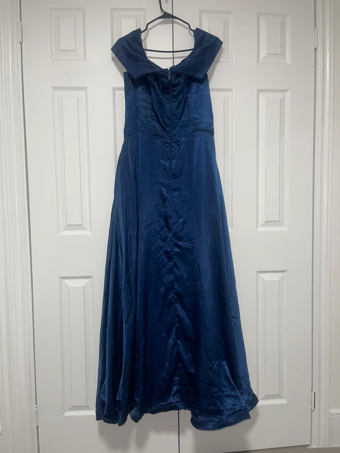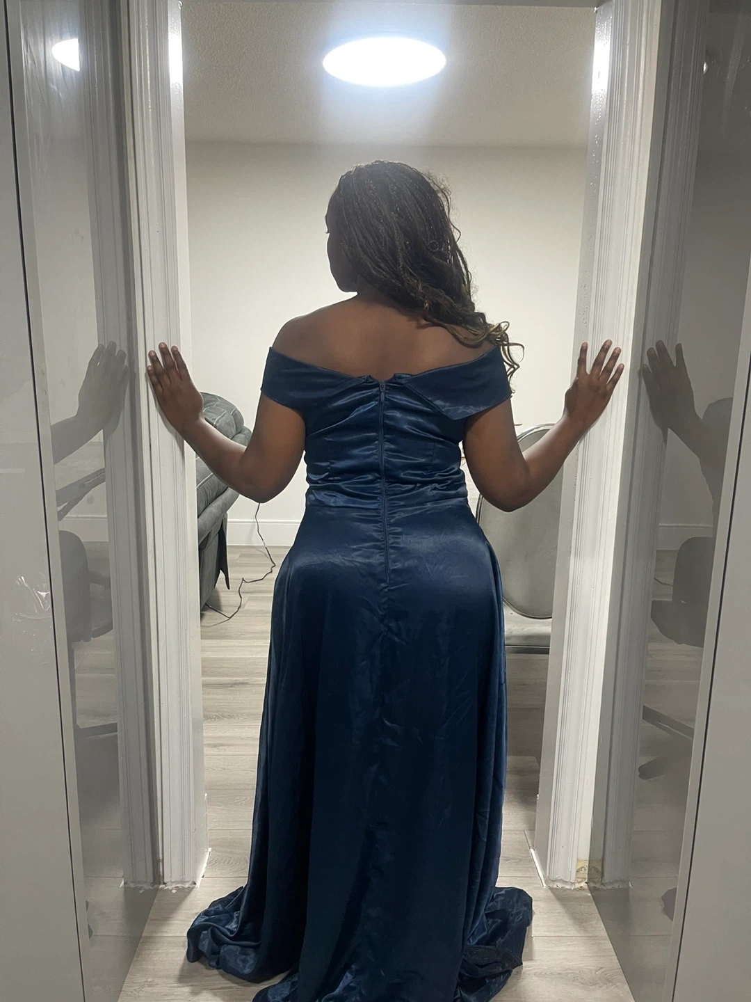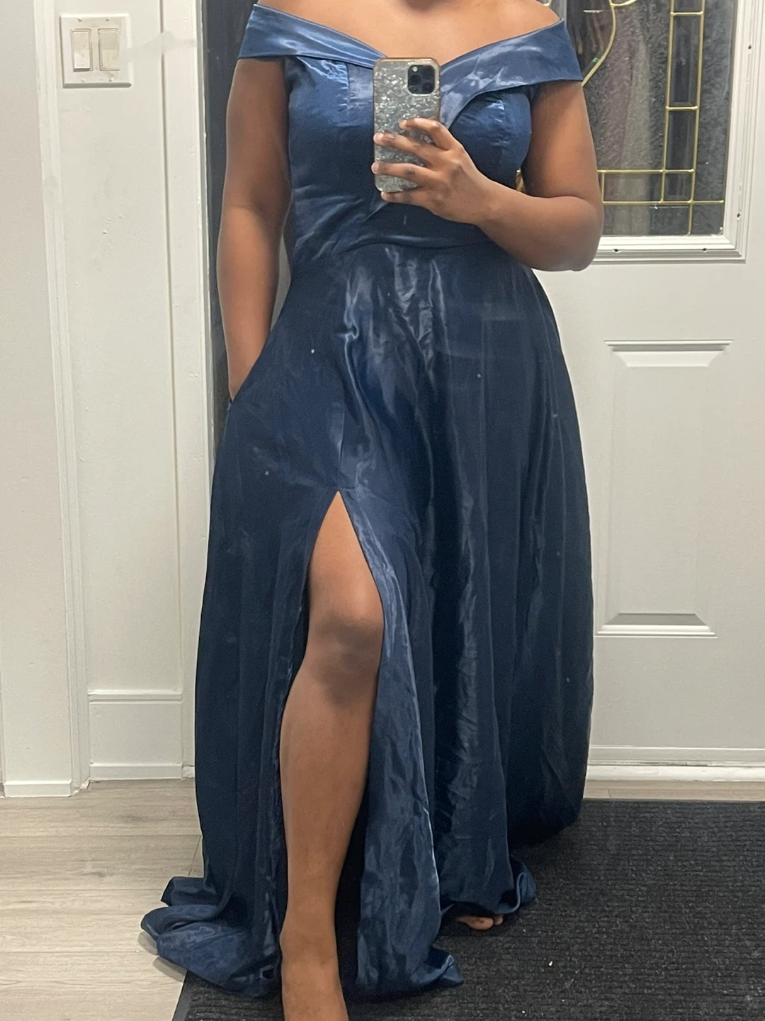 Selling a beautiful blue off-shoulder formal dress. It features a flattering neckline and a stylish high slit and pockets. Perfect for a special occasion!