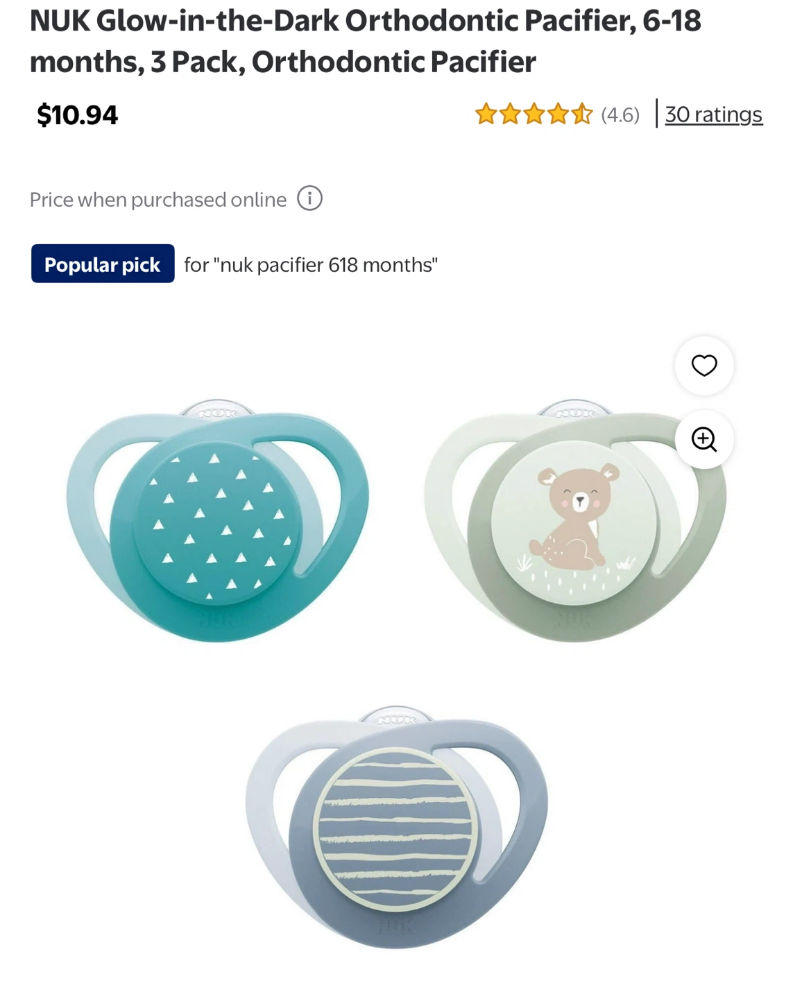 Selling a NUK Glow-in-the-Dark Orthodontic Pacifier, perfect for babies aged 6-18 months! The pacifier is designed with a breast-like nipple shape to soothe your baby. Its heart-shaped shield fits perfectly under the baby's nose for easy breathing. Accepted by 96% of babies!