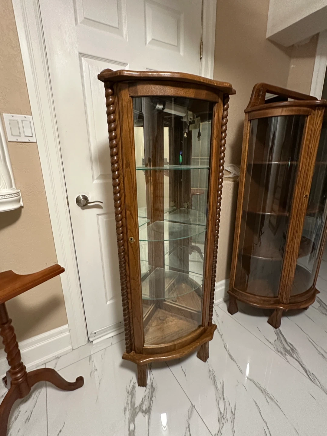Selling a lovely vintage corner curio display cabinet! It features a wood frame with glass panels, perfect for showcasing your favourite collectibles or decorative items. It's in great shape and ready to add a touch of elegance to your home (key included)