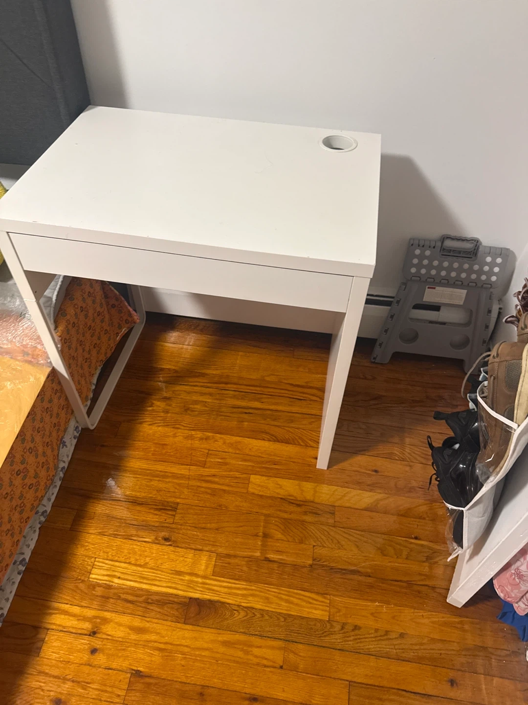 Selling a simple white desk that's perfect for a small workspace or student. It includes a convenient drawer for storing your pens, notebooks, and other essentials. It's in great condition and ready for a new home!