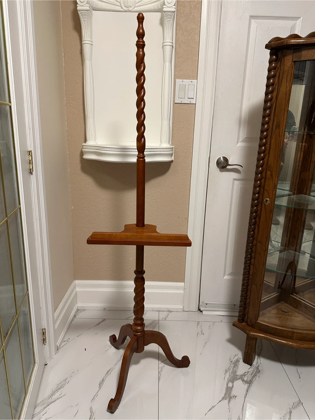 Selling a vintage wooden music stand. It has a beautiful, classic design with a twisted stem and tripod base. Perfect for musicians or anyone looking for a unique decorative piece for their home!