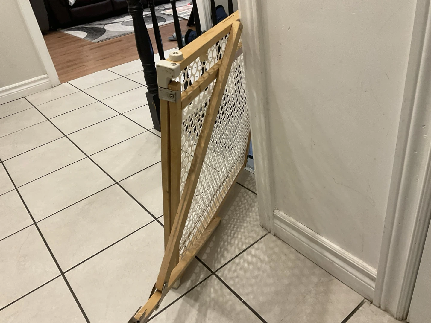 Selling a gently used baby/pet gate. It's made of wood and white plastic, and it's adjustable to fit different spaces. Perfect for keeping your little ones safe!