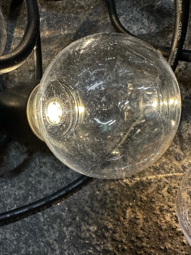 Brighten up your outdoor space with these Globe String Lights, perfect for patios, gardens, or balconies. These lights are in used condition but still provide a warm and inviting glow. They are ideal for creating a cozy atmosphere for evening gatherings. * Bulb Type: Globe * Cord Colour: Black * Power Source: Plug-in Looking to add a touch of magic to your backyard? These string lights are just the ticket!