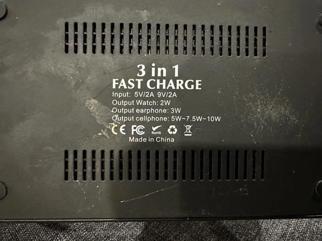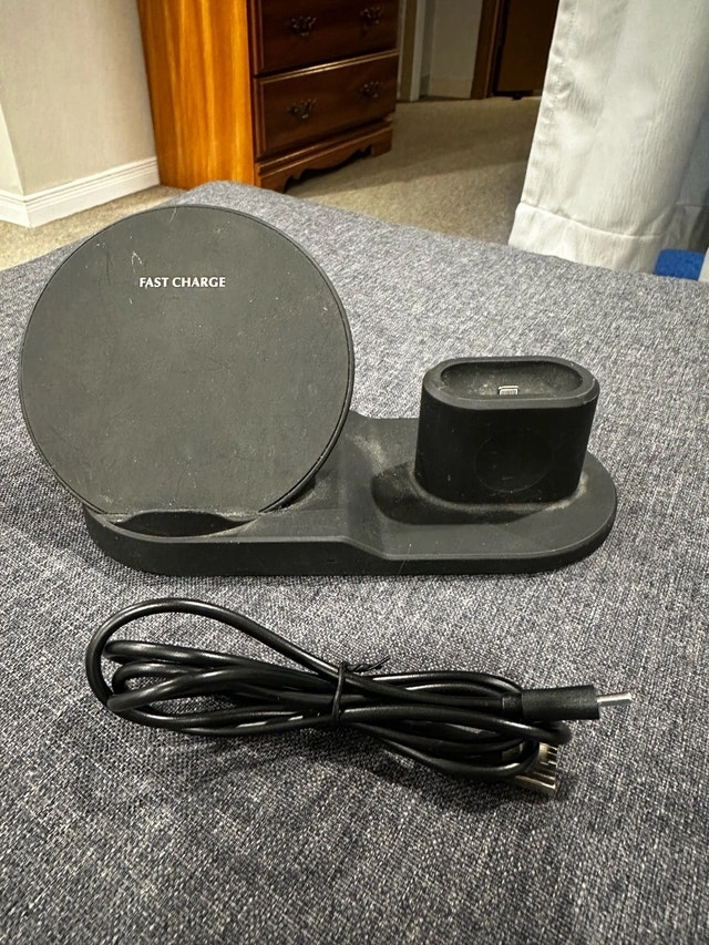 This is a 3 in 1 Fast Charge wireless charging station, compatible with phones, watches, and ear buds. The charging station is previously used, with some cosmetic wear and tear, but it is in good working condition.
