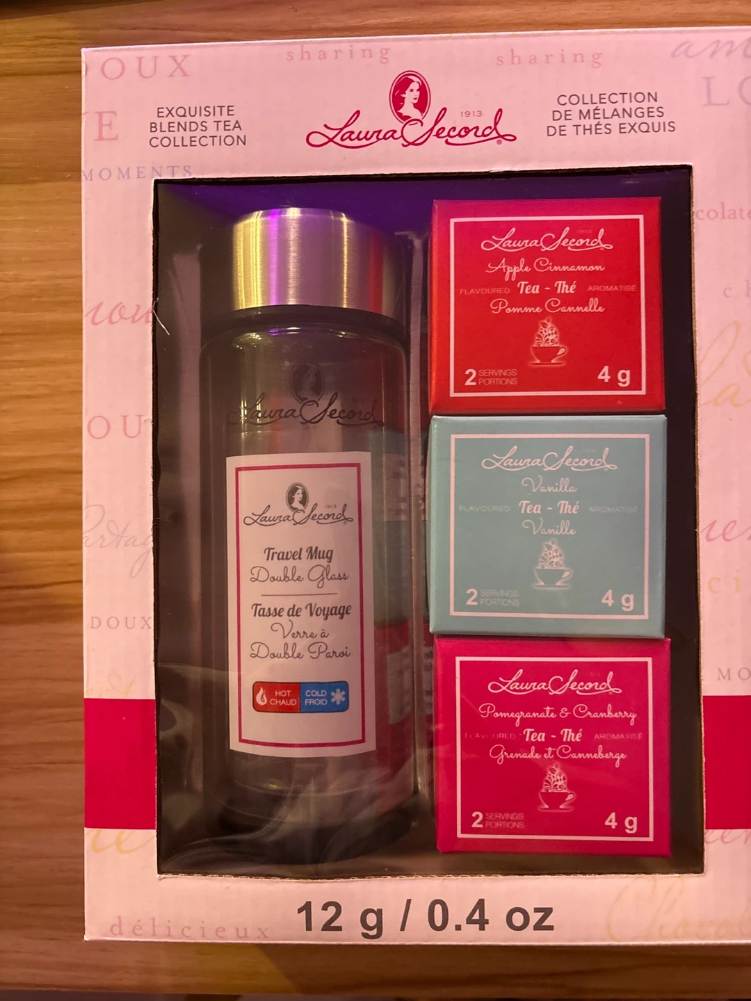 This Laura Secord tea collection set includes a double glass travel mug and three different tea flavours: Apple Cinnamon, Vanilla, and Pomegranate & Cranberry. Each flavour comes with two servings. Perfect for tea lovers!