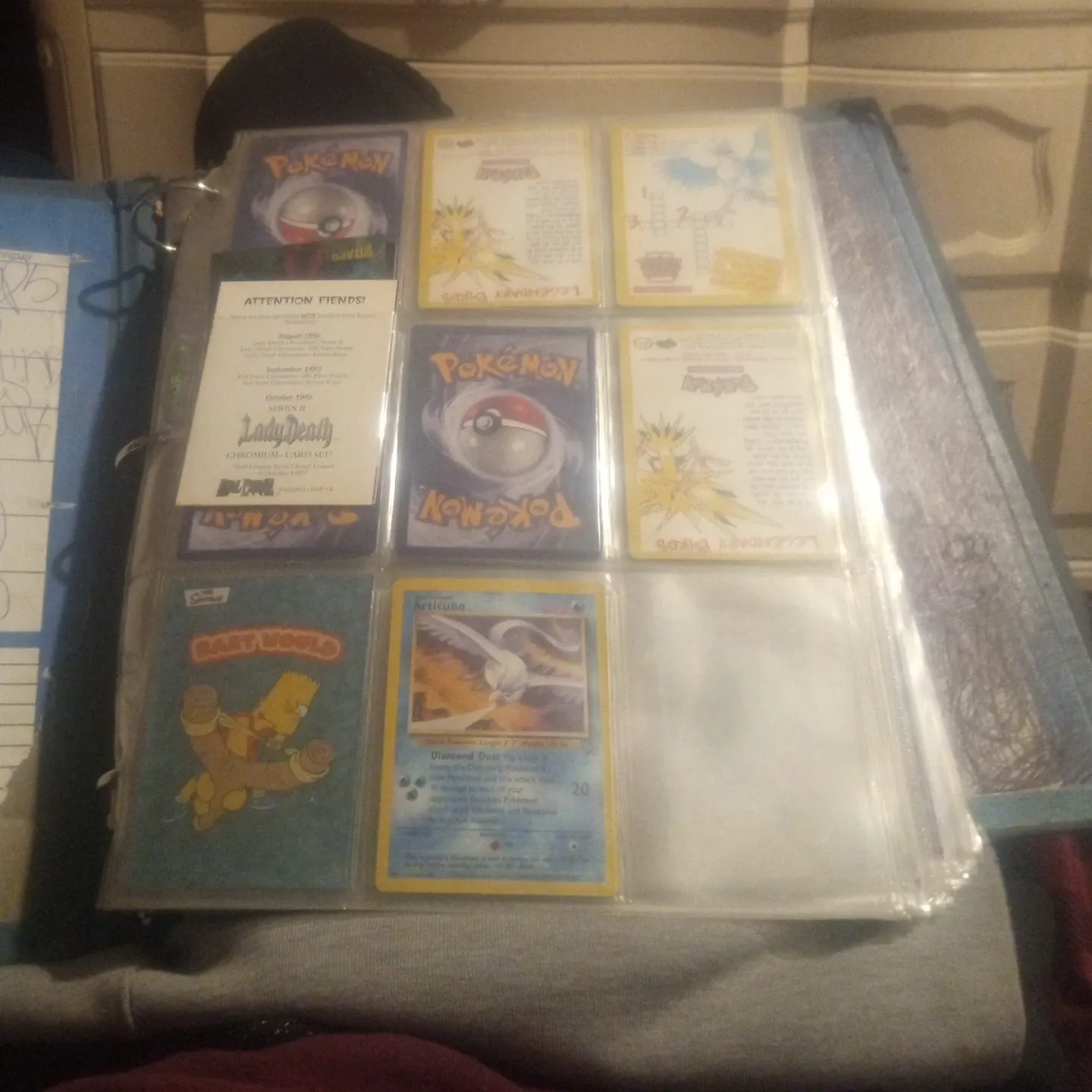 Selling a collection of Pokemon and Lady Death trading cards. Includes cards like Articuno and others from the Legendary Birds set. Also features a Bart World card. Perfect for collectors! 9 cards