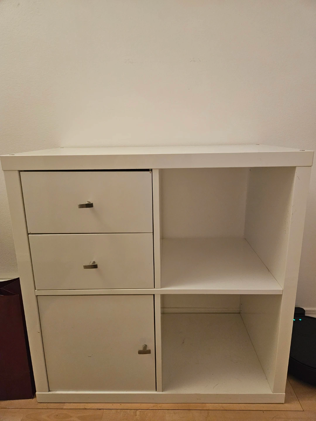 Selling a white IKEA Kallax shelf unit! It's in good condition and offers a mix of drawers, a cabinet, and open shelving for versatile storage. Perfect for organizing your space!