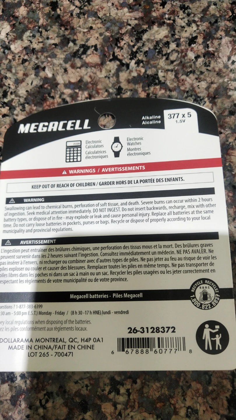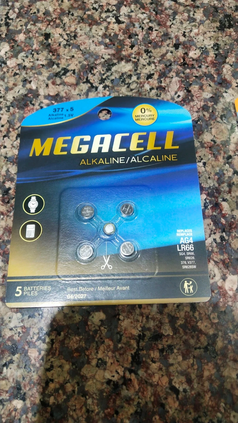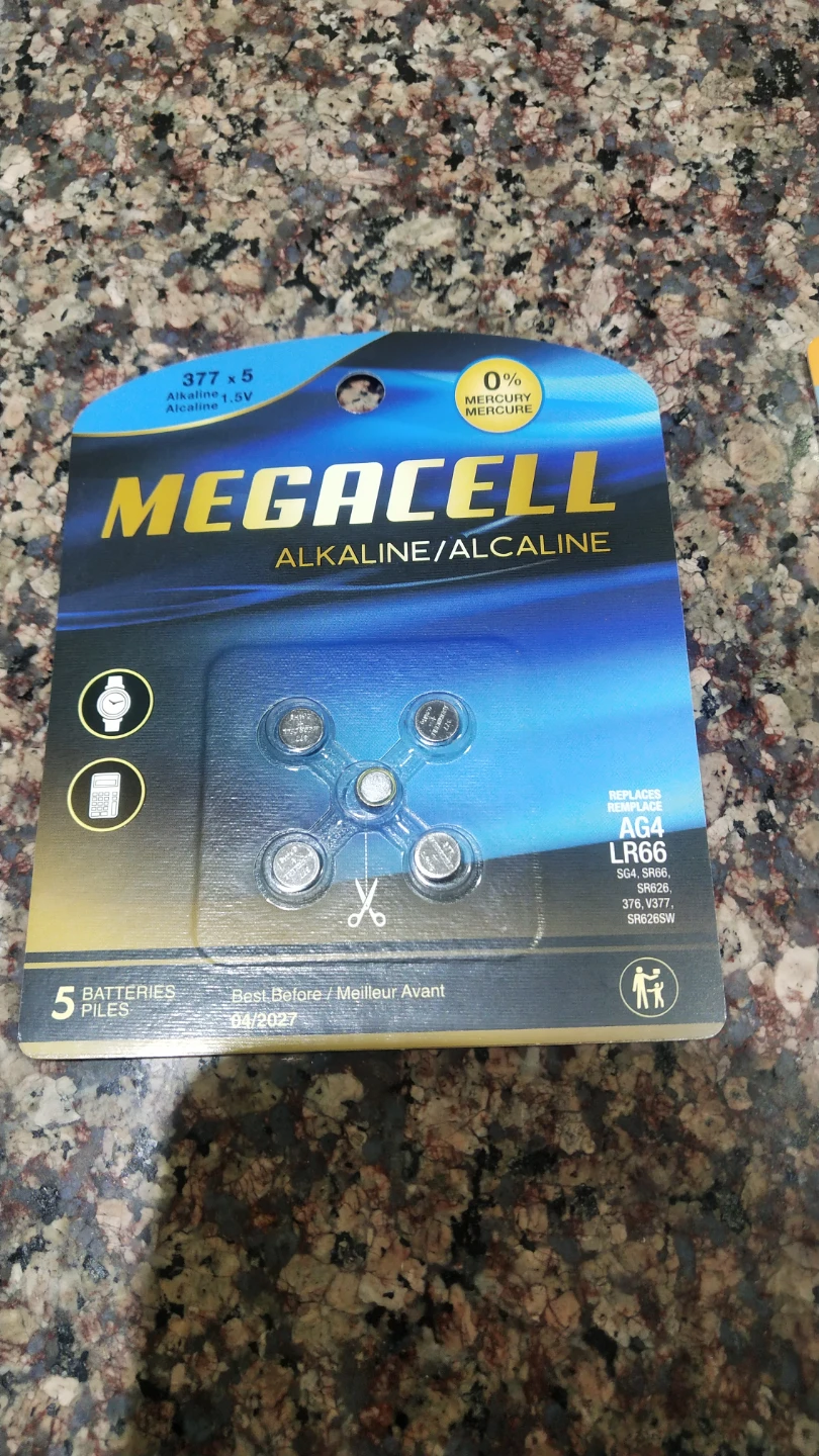 Selling a brand new pack of Megacell alkaline batteries! This pack contains 5 batteries, size 377 x 5, with 1.5V each.