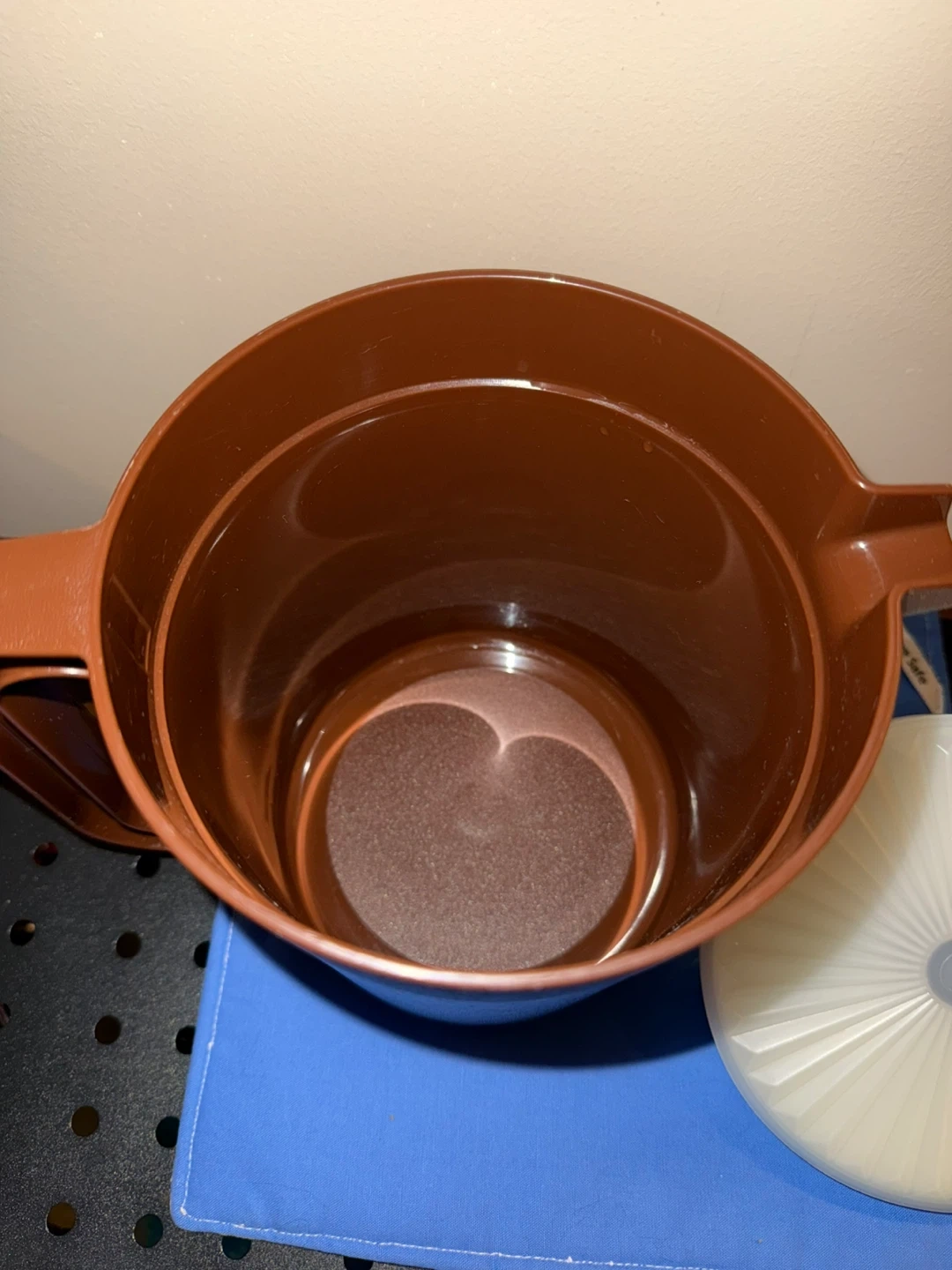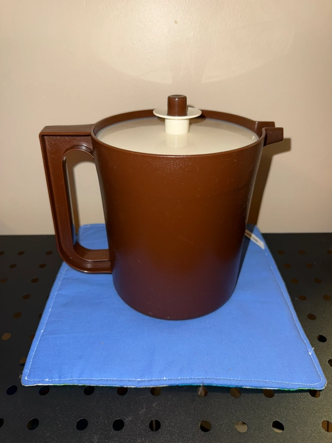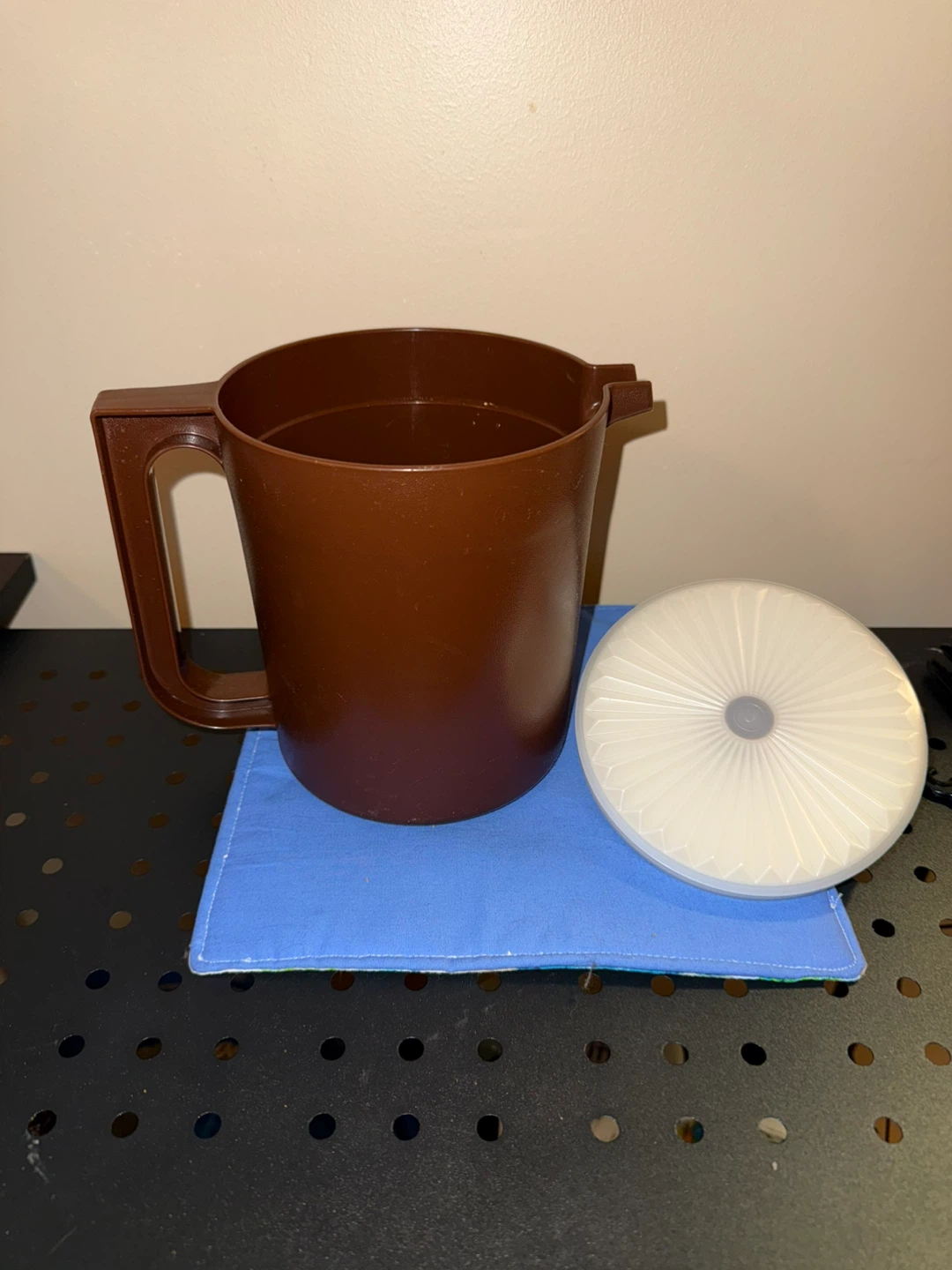 Selling a classic Tupperware mini pitcher in a lovely brown colour! Holds 8 cups of liquid It comes with its original white lid. It's in great condition and ready to be used. Made in Canada!