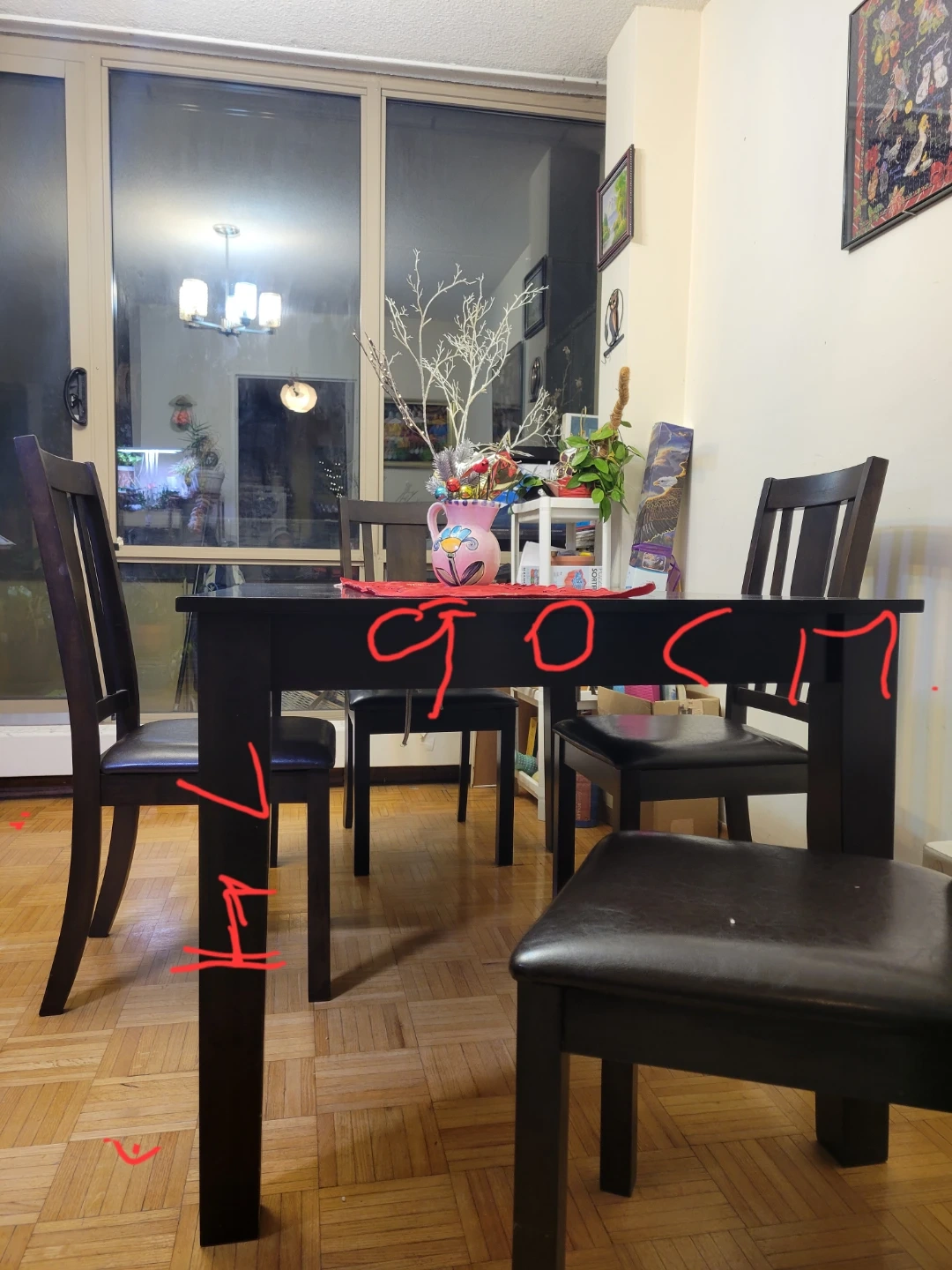 Selling a dining table with 4 chairs, perfect for a cozy dining space! The table is dark brown and measures 150cm in length and 90cm in width. The chairs have leather seats.
