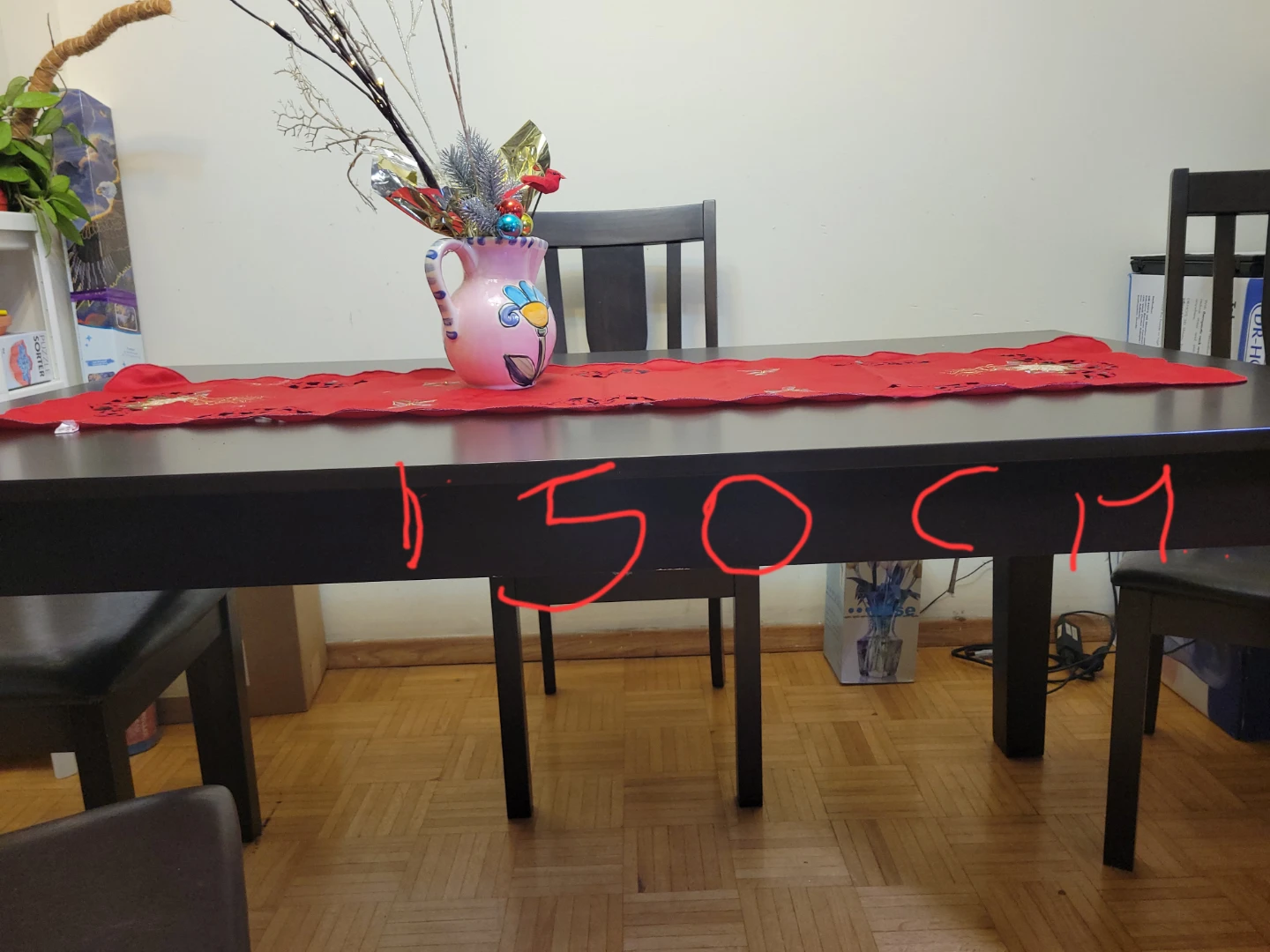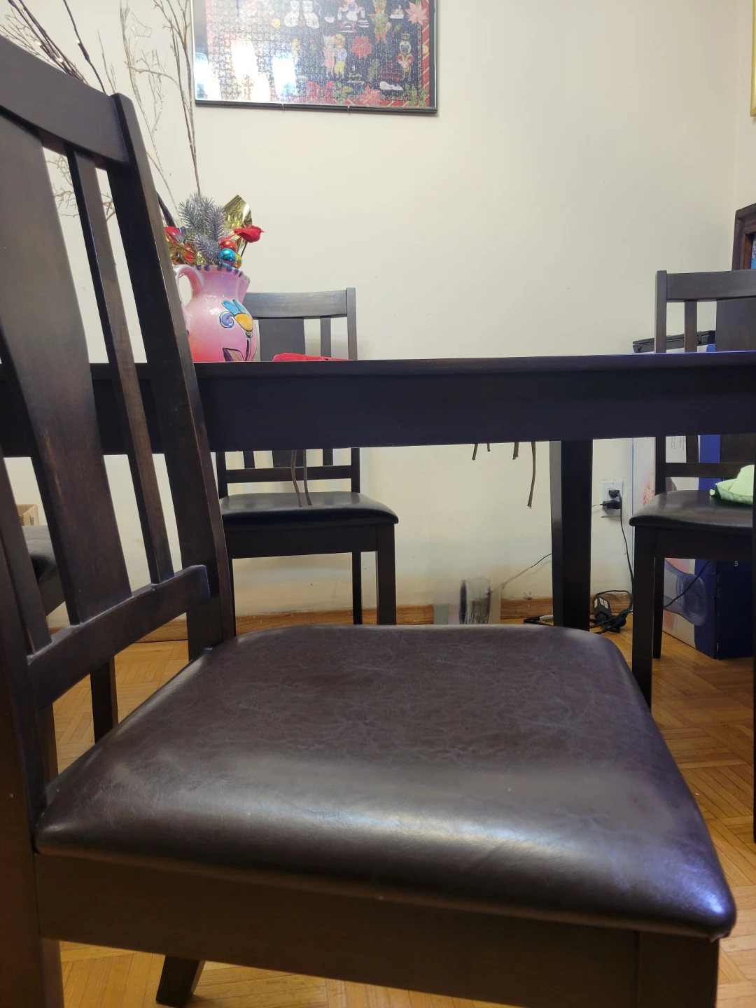 Selling a dining table with 4 chairs, perfect for a cozy dining space! The table is dark brown and measures 150cm in length and 90cm in width. The chairs have leather seats.